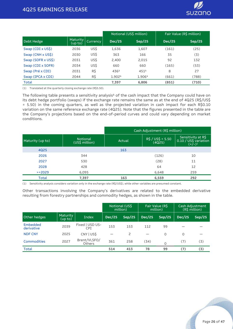 Notional (US$ million) Fair Value (R$ million) Debt Hedge Maturity (up to) Currency Dec/25 Sep/25 Dec/25 Sep/25 Swap (CDI x US$) 2036 US$ 1,636 1,607 (161) (25) Swap (CNH x US$) 2030 US$ 363 166 35 (3) Swap (SOFR x US$) 2031 US$ 2,400 2,015 92 132 Swap (CDI x SOFR) 2034 US$ 660 660 (165) (53) Swap (Pré x CDI) 2031 R$ 436¹ 451¹ 8 27 Swap (IPCA x CDI) 2044 R$ 1.902¹ 1.906¹ (661) (788) Total 7,397 6,806 (851) (710) (1) Translated at the quarterly closing exchange rate (R$5.50). The following table presents a sensitivity analysis¹ of the cash impact that the Company could have on its debt hedge portfolio (swaps) if the exchange rate remains the same as at the end of 4Q25 (R$/US$ = 5.50) in the coming quarters, as well as the projected variation in cash impact for each R$0.10 variation on the same reference exchange rate (4Q25). Note that the figures presented in the table are the Company’s projections based on the end-of-period curves and could vary depending on market conditions. Cash Adjustment (R$ million) Maturity (up to) Notional (US$ million) Actual R$ / US$ = 5.50 (4Q25) Sensitivity at R$ 0.10 / US$ variation (+/-)1 4Q25 163 2026 344 (126) 10 2027 530 (28) 11 2028 428 64 12 >=2029 6,095 6,648 259 Total 7,397 163 6,559 292 (1) Sensitivity analysis considers variation only in the exchange rate (R$/US$), while other variables are presumed constant. Other transactions involving the Company’s derivatives are related to the embedded derivative resulting from forestry partnerships and commodity hedges, as shown in the table. Notional (US$ million) Fair Value (R$ million) Cash Adjustment (R$ million) Other hedges Maturity (up to) Index Dec/25 Sep/25 Dec/25 Sep/25 Dec/25 Sep/25 Embedded derivative 2039 Fixed | USD US- CPI 153 153 112 99 — — NDF CNY 2025 CNY | US$ — 2 — 0 0 — Commodities 2027 Brent/VLSFO/ Others 361 258 (34) 0 (7) (3) Total 514 413 78 99 (7) (3) 4Q25 EARNINGS RELEASE Page 26 of 47