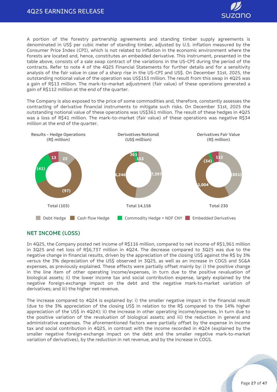 A portion of the forestry partnership agreements and standing timber supply agreements is denominated in US$ per cubic meter of standing timber, adjusted by U.S. inflation measured by the Consumer Price Index (CPI), which is not related to inflation in the economic environment where the forests are located and, hence, constitutes an embedded derivative. This instrument, presented in the table above, consists of a sale swap contract of the variations in the US-CPI during the period of the contracts. Refer to note 4 of the 4Q25 Financial Statements for further details and for a sensitivity analysis of the fair value in case of a sharp rise in the US-CPI and US$. On December 31st, 2025, the outstanding notional value of the operation was US$153 million. The result from this swap in 4Q25 was a gain of R$13 million. The mark-to-market adjustment (fair value) of these operations generated a gain of R$112 million at the end of the quarter. The Company is also exposed to the price of some commodities and, therefore, constantly assesses the contracting of derivative financial instruments to mitigate such risks. On December 31st, 2025 the outstanding notional value of these operations was US$361 million. The result of these hedges in 4Q25 was a loss of R$41 million. The mark-to-market (fair value) of these operations was negative R$34 million at the end of the quarter. Results - Hedge Operations (R$ million) 22 (97) (41) 13 Total (103) Derivatives Notional (US$ million) 7,3976,246 361 153 Total 14,158 Derivatives Fair Value (R$ million) (851) 1,004 (34) 112 Total 230 Debt Hedge Cash flow Hedge Commodity Hedge + NDF CNY Embedded Derivatives NET INCOME (LOSS) In 4Q25, the Company posted net income of R$116 million, compared to net income of R$1,961 million in 3Q25 and net loss of R$6,737 million in 4Q24. The decrease compared to 3Q25 was due to the negative change in financial results, driven by the appreciation of the closing US$ against the R$ by 3% versus the 3% depreciation of the US$ observed in 3Q25, as well as an increase in COGS and SG&A expenses, as previously explained. These effects were partially offset mainly by: i) the positive change in the line item of other operating income/expenses, in turn due to the positive revaluation of biological assets; ii) the lower income tax and social contribution expense, largely explained by the negative foreign-exchange impact on the debt and the negative mark-to-market variation of derivatives; and iii) the higher net revenue. The increase compared to 4Q24 is explained by: i) the smaller negative impact in the financial result (due to the 3% appreciation of the closing US$ in relation to the R$ compared to the 14% higher appreciation of the US$ in 4Q24); ii) the increase in other operating income/expenses, in turn due to the positive variation of the revaluation of biological assets; and iii) the reduction in general and administrative expenses. The aforementioned factors were partially offset by the expense in income tax and social contribution in 4Q25, in contrast with the income recorded in 4Q24 (explained by the smaller negative foreign-exchange impact on the debt and the smaller negative mark-to-market variation of derivatives), by the reduction in net revenue, and by the increase in COGS. 4Q25 EARNINGS RELEASE Page 27 of 47