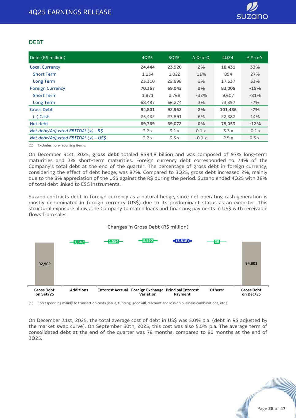 DEBT Debt (R$ million) 4Q25 3Q25 Δ Q-o-Q 4Q24 Δ Y-o-Y Local Currency 24,444 23,920 2% 18,431 33% Short Term 1,134 1,022 11% 894 27% Long Term 23,310 22,898 2% 17,537 33% Foreign Currency 70,357 69,042 2% 83,005 -15% Short Term 1,871 2,768 -32% 9,607 -81% Long Term 68,487 66,274 3% 73,397 -7% Gross Debt 94,801 92,962 2% 101,436 -7% (-) Cash 25,432 23,891 6% 22,382 14% Net debt 69,369 69,072 0% 79,053 -12% Net debt/Adjusted EBITDA¹ (x) - R$ 3.2 x 3.1 x 0.1 x 3.3 x -0.1 x Net debt/Adjusted EBITDA¹ (x) – US$ 3.2 x 3.3 x -0.1 x 2.9 x 0.3 x (1) Excludes non-recurring items. On December 31st, 2025, gross debt totaled R$94.8 billion and was composed of 97% long-term maturities and 3% short-term maturities. Foreign currency debt corresponded to 74% of the Company's total debt at the end of the quarter. The percentage of gross debt in foreign currency, considering the effect of debt hedge, was 87%. Compared to 3Q25, gross debt increased 2%, mainly due to the 3% appreciation of the US$ against the R$ during the period. Suzano ended 4Q25 with 38% of total debt linked to ESG instruments. Suzano contracts debt in foreign currency as a natural hedge, since net operating cash generation is mostly denominated in foreign currency (US$) due to its predominant status as an exporter. This structural exposure allows the Company to match loans and financing payments in US$ with receivable flows from sales. Changes in Gross Debt (R$ million) (1) Corresponding mainly to transaction costs (issue, funding, goodwill, discount and loss on business combinations, etc.). On December 31st, 2025, the total average cost of debt in US$ was 5.0% p.a. (debt in R$ adjusted by the market swap curve). On September 30th, 2025, this cost was also 5.0% p.a. The average term of consolidated debt at the end of the quarter was 78 months, compared to 80 months at the end of 3Q25. 4Q25 EARNINGS RELEASE Page 28 of 47