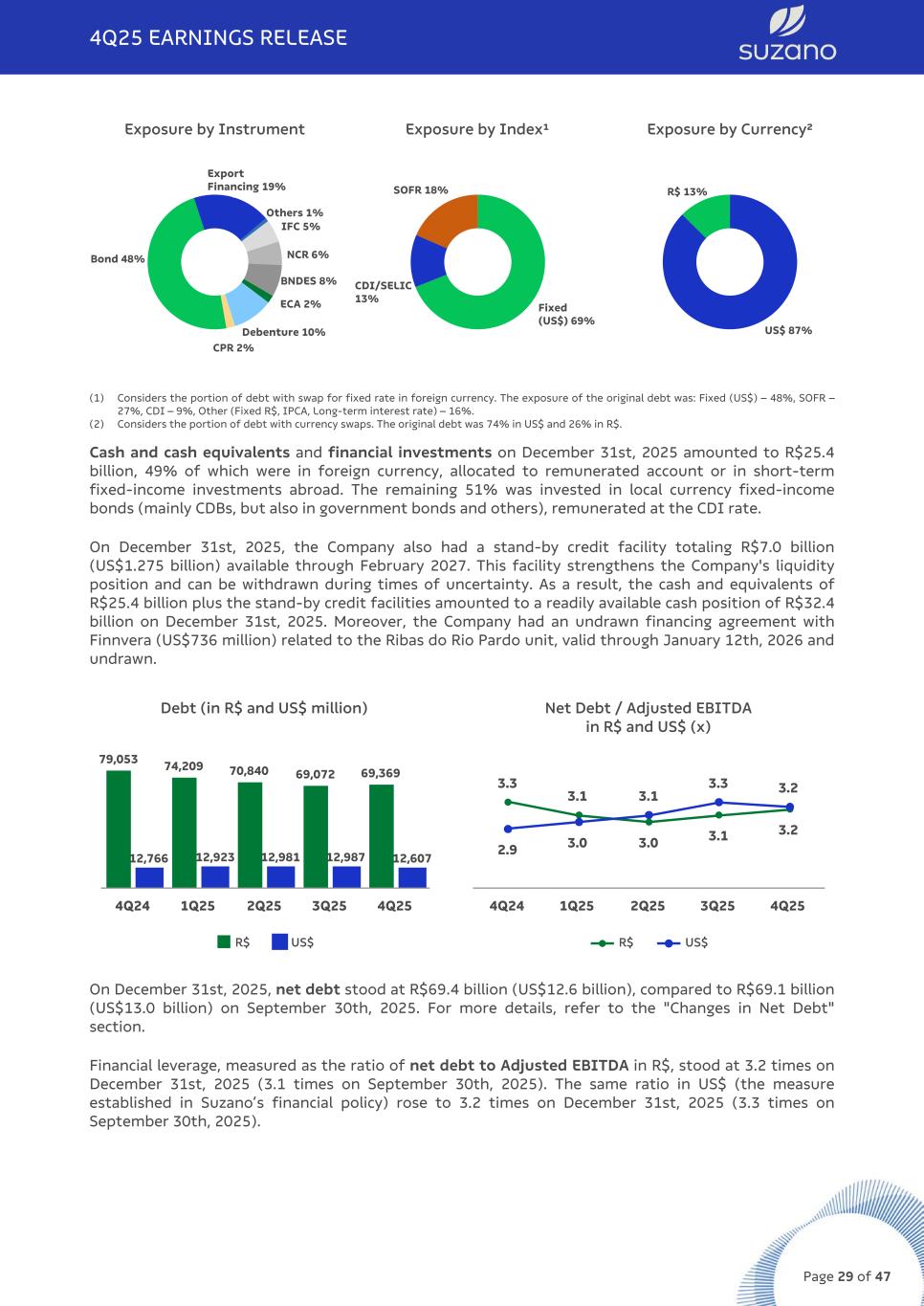 Exposure by Instrument Bond 48% Export Financing 19% Others 1% IFC 5% NCR 6% BNDES 8% ECA 2% Debenture 10% CPR 2% Exposure by Index¹ Fixed (US$) 69% CDI/SELIC 13% SOFR 18% Exposure by Currency² US$ 87% R$ 13% (1) Considers the portion of debt with swap for fixed rate in foreign currency. The exposure of the original debt was: Fixed (US$) – 48%, SOFR – 27%, CDI – 9%, Other (Fixed R$, IPCA, Long-term interest rate) – 16%. (2) Considers the portion of debt with currency swaps. The original debt was 74% in US$ and 26% in R$. Cash and cash equivalents and financial investments on December 31st, 2025 amounted to R$25.4 billion, 49% of which were in foreign currency, allocated to remunerated account or in short-term fixed-income investments abroad. The remaining 51% was invested in local currency fixed-income bonds (mainly CDBs, but also in government bonds and others), remunerated at the CDI rate. On December 31st, 2025, the Company also had a stand-by credit facility totaling R$7.0 billion (US$1.275 billion) available through February 2027. This facility strengthens the Company's liquidity position and can be withdrawn during times of uncertainty. As a result, the cash and equivalents of R$25.4 billion plus the stand-by credit facilities amounted to a readily available cash position of R$32.4 billion on December 31st, 2025. Moreover, the Company had an undrawn financing agreement with Finnvera (US$736 million) related to the Ribas do Rio Pardo unit, valid through January 12th, 2026 and undrawn. Debt (in R$ and US$ million) 79,053 74,209 70,840 69,072 69,369 12,766 12,923 12,981 12,987 12,607 R$ US$ 4Q24 1Q25 2Q25 3Q25 4Q25 Net Debt / Adjusted EBITDA in R$ and US$ (x) 3.3 3.1 3.0 3.1 3.2 2.9 3.0 3.1 3.3 3.2 R$ US$ 4Q24 1Q25 2Q25 3Q25 4Q25 On December 31st, 2025, net debt stood at R$69.4 billion (US$12.6 billion), compared to R$69.1 billion (US$13.0 billion) on September 30th, 2025. For more details, refer to the "Changes in Net Debt" section. Financial leverage, measured as the ratio of net debt to Adjusted EBITDA in R$, stood at 3.2 times on December 31st, 2025 (3.1 times on September 30th, 2025). The same ratio in US$ (the measure established in Suzano’s financial policy) rose to 3.2 times on December 31st, 2025 (3.3 times on September 30th, 2025). 4Q25 EARNINGS RELEASE Page 29 of 47