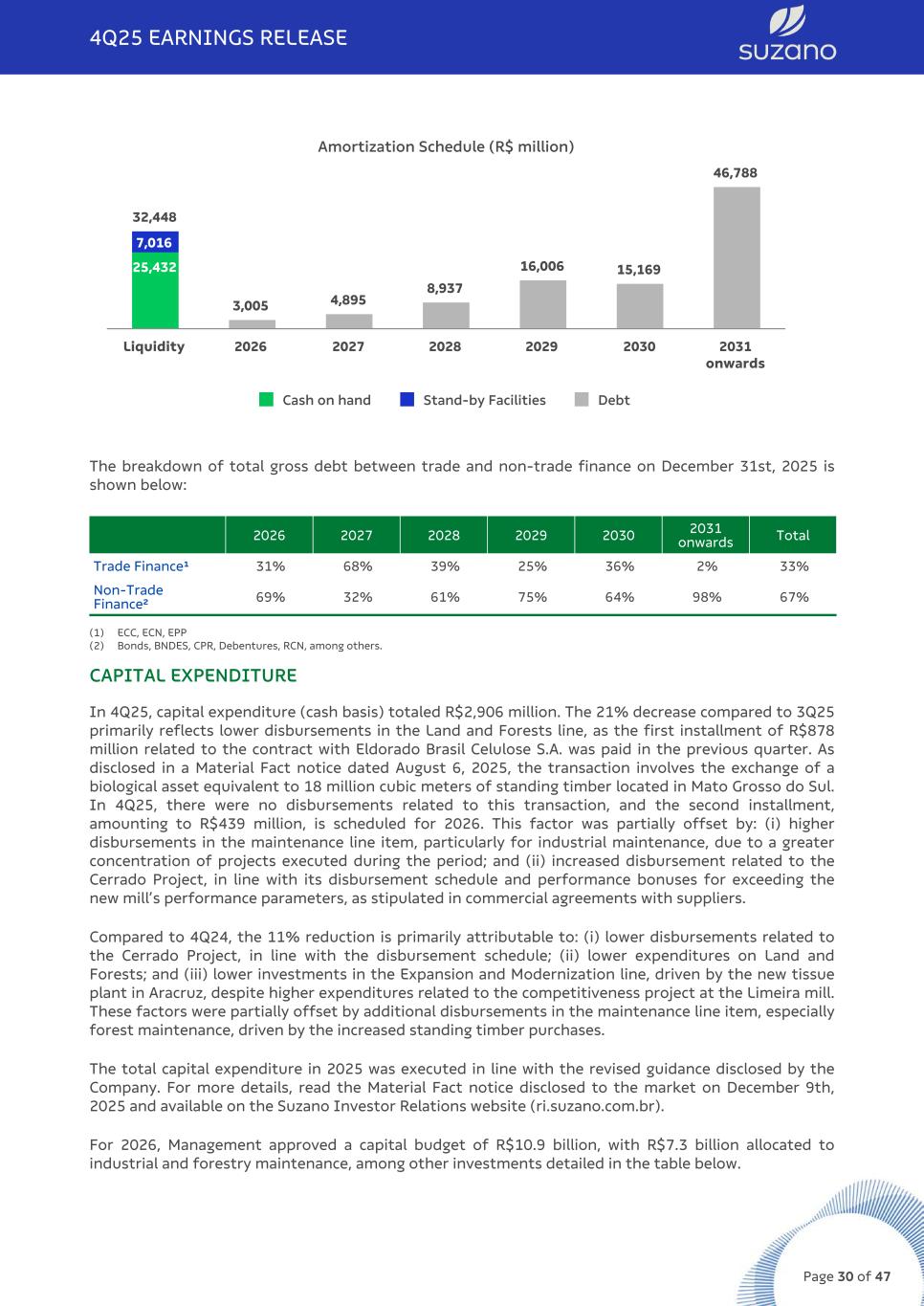 Amortization Schedule (R$ million) 32,448 3,005 4,895 8,937 16,006 15,169 46,788 25,432 7,016 Cash on hand Stand-by Facilities Debt Liquidity 2026 2027 2028 2029 2030 2031 onwards The breakdown of total gross debt between trade and non-trade finance on December 31st, 2025 is shown below: 2026 2027 2028 2029 2030 2031 onwards Total Trade Finance¹ 31% 68% 39% 25% 36% 2% 33% Non-Trade Finance² 69% 32% 61% 75% 64% 98% 67% (1) ECC, ECN, EPP (2) Bonds, BNDES, CPR, Debentures, RCN, among others. CAPITAL EXPENDITURE In 4Q25, capital expenditure (cash basis) totaled R$2,906 million. The 21% decrease compared to 3Q25 primarily reflects lower disbursements in the Land and Forests line, as the first installment of R$878 million related to the contract with Eldorado Brasil Celulose S.A. was paid in the previous quarter. As disclosed in a Material Fact notice dated August 6, 2025, the transaction involves the exchange of a biological asset equivalent to 18 million cubic meters of standing timber located in Mato Grosso do Sul. In 4Q25, there were no disbursements related to this transaction, and the second installment, amounting to R$439 million, is scheduled for 2026. This factor was partially offset by: (i) higher disbursements in the maintenance line item, particularly for industrial maintenance, due to a greater concentration of projects executed during the period; and (ii) increased disbursement related to the Cerrado Project, in line with its disbursement schedule and performance bonuses for exceeding the new mill’s performance parameters, as stipulated in commercial agreements with suppliers. Compared to 4Q24, the 11% reduction is primarily attributable to: (i) lower disbursements related to the Cerrado Project, in line with the disbursement schedule; (ii) lower expenditures on Land and Forests; and (iii) lower investments in the Expansion and Modernization line, driven by the new tissue plant in Aracruz, despite higher expenditures related to the competitiveness project at the Limeira mill. These factors were partially offset by additional disbursements in the maintenance line item, especially forest maintenance, driven by the increased standing timber purchases. The total capital expenditure in 2025 was executed in line with the revised guidance disclosed by the Company. For more details, read the Material Fact notice disclosed to the market on December 9th, 2025 and available on the Suzano Investor Relations website (ri.suzano.com.br). For 2026, Management approved a capital budget of R$10.9 billion, with R$7.3 billion allocated to industrial and forestry maintenance, among other investments detailed in the table below. 4Q25 EARNINGS RELEASE Page 30 of 47