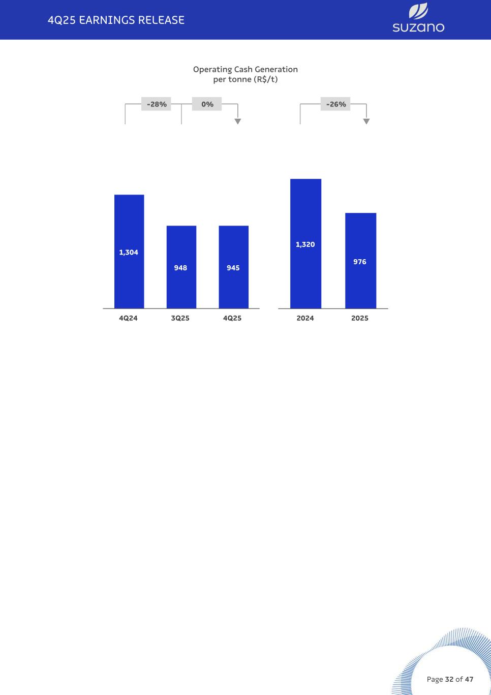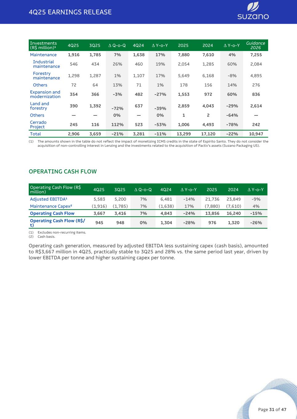 Investments (R$ million)¹ 4Q25 3Q25 Δ Q-o-Q 4Q24 Δ Y-o-Y 2025 2024 Δ Y-o-Y Guidance 2026 Maintenance 1,916 1,785 7% 1,638 17% 7,880 7,610 4% 7,255 Industrial maintenance 546 434 26% 460 19% 2,054 1,285 60% 2,084 Forestry maintenance 1,298 1,287 1% 1,107 17% 5,649 6,168 -8% 4,895 Others 72 64 13% 71 1% 178 156 14% 276 Expansion and modernization 354 366 -3% 482 -27% 1,553 972 60% 836 Land and forestry 390 1,392 -72% 637 -39% 2,859 4,043 -29% 2,614 Others — — 0% — 0% 1 2 -64% — Cerrado Project 245 116 112% 523 -53% 1,006 4,493 -78% 242 Total 2,906 3,659 -21% 3,281 -11% 13,299 17,120 -22% 10,947 (1) The amounts shown in the table do not reflect the impact of monetizing ICMS credits in the state of Espírito Santo. They do not consider the acquisition of non-controlling interest in Lenzing and the investments related to the acquisition of Pactiv's assets (Suzano Packaging US). OPERATING CASH FLOW Operating Cash Flow (R$ million) 4Q25 3Q25 Δ Q-o-Q 4Q24 Δ Y-o-Y 2025 2024 Δ Y-o-Y Adjusted EBITDA¹ 5,583 5,200 7% 6,481 -14% 21,736 23,849 -9% Maintenance Capex² (1,916) (1,785) 7% (1,638) 17% (7,880) (7,610) 4% Operating Cash Flow 3,667 3,416 7% 4,843 -24% 13,856 16,240 -15% Operating Cash Flow (R$/ t) 945 948 0% 1,304 -28% 976 1,320 -26% (1) Excludes non-recurring items. (2) Cash basis. Operating cash generation, measured by adjusted EBITDA less sustaining capex (cash basis), amounted to R$3,667 million in 4Q25, practically stable to 3Q25 and 28% vs. the same period last year, driven by lower EBITDA per tonne and higher sustaining capex per tonne. 4Q25 EARNINGS RELEASE Page 31 of 47