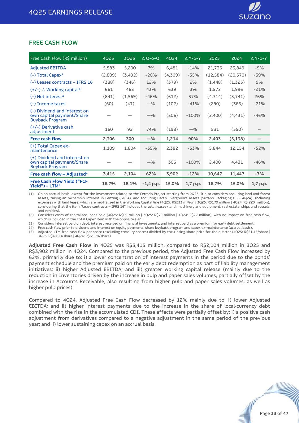 FREE CASH FLOW Free Cash Flow (R$ million) 4Q25 3Q25 Δ Q-o-Q 4Q24 Δ Y-o-Y 2025 2024 Δ Y-o-Y Adjusted EBITDA 5,583 5,200 7% 6,481 -14% 21,736 23,849 -9% (-) Total Capex¹ (2,809) (3,492) -20% (4,309) -35% (12,584) (20,570) -39% (-) Leases contracts – IFRS 16 (388) (346) 12% (379) 2% (1,448) (1,325) 9% (+/-) △ Working capital² 661 463 43% 639 3% 1,572 1,996 -21% (-) Net interest³ (841) (1,569) -46% (612) 37% (4,714) (3,741) 26% (-) Income taxes (60) (47) —% (102) -41% (290) (366) -21% (-) Dividend and interest on own capital payment/Share Buyback Program — — —% (306) -100% (2,400) (4,431) -46% (+/-) Derivative cash adjustment 160 92 74% (198) —% 531 (550) — Free cash flow 2,306 300 —% 1,214 90% 2,403 (5,138) — (+) Total Capex ex- maintenance 1,109 1,804 -39% 2,382 -53% 5,844 12,154 -52% (+) Dividend and interest on own capital payment/Share Buyback Program — — —% 306 -100% 2,400 4,431 -46% Free cash flow – Adjusted4 3,415 2,104 62% 3,902 -12% 10,647 11,447 -7% Free Cash Flow Yield ("FCF Yield") - LTM5 16.7% 18.1% -1,4 p.p. 15.0% 1,7 p.p. 16.7% 15.0% 1,7 p.p. (1) On an accrual basis, except for the investment related to the Cerrado Project starting from 2Q23. It also considers acquiring land and forest assets, taking an ownership interest in Lenzing (3Q24), and acquiring Pactiv Evergreen's assets (Suzano Packaging US - 4Q24). Including expenses with land lease, which are neutralized in the Working Capital line (4Q25: R$233 million | 3Q25: R$179 million | 4Q24: R$ 220 million), considering that the item "Lease contracts – IFRS 16" includes the total leases (land, machinery and equipment, real estate, ships and vessels, and vehicles). (2) Considers costs of capitalized loans paid (4Q25: R$69 million | 3Q25: R$79 million | 4Q24: R$77 million), with no impact on free cash flow, which is included in the Total Capex item with the opposite sign. (3) Considers interest paid on debt, interest received on financial investments, and interest paid as a premium for early debt settlement. (4) Free cash flow prior to dividend and interest on equity payments, share buyback program and capex ex-maintenance (accrual basis). (5) Adjusted LTM free cash flow per share (excluding treasury shares) divided by the closing share price for the quarter (4Q25: R$51.45/share | 3Q25: R$49.90/share | 4Q24: R$61.78/share). Adjusted Free Cash Flow in 4Q25 was R$3,415 million, compared to R$2,104 million in 3Q25 and R$3,902 million in 4Q24. Compared to the previous period, the Adjusted Free Cash Flow increased by 62%, primarily due to: i) a lower concentration of interest payments in the period due to the bonds’ payment schedule and the premium paid on the early debt redemption as part of liability management initiatives; ii) higher Adjusted EBITDA; and iii) greater working capital release (mainly due to the reduction in Inventories driven by the increase in pulp and paper sales volumes, partially offset by the increase in Accounts Receivable, also resulting from higher pulp and paper sales volumes, as well as higher pulp prices). Compared to 4Q24, Adjusted Free Cash Flow decreased by 12% mainly due to: i) lower Adjusted EBITDA; and ii) higher interest payments due to the increase in the share of local-currency debt combined with the rise in the accumulated CDI. These effects were partially offset by: i) a positive cash adjustment from derivatives compared to a negative adjustment in the same period of the previous year; and ii) lower sustaining capex on an accrual basis. 4Q25 EARNINGS RELEASE Page 33 of 47
