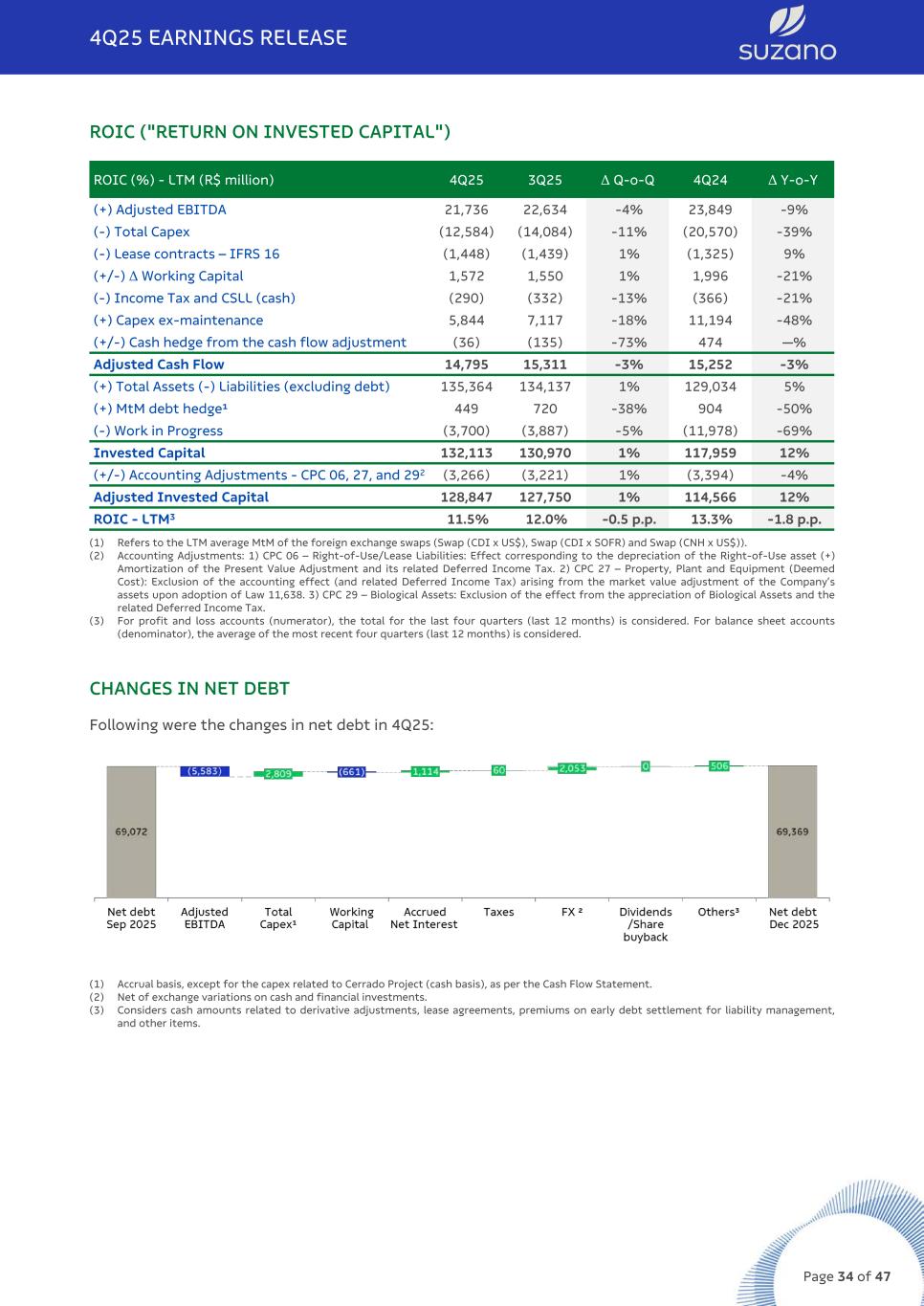 ROIC ("RETURN ON INVESTED CAPITAL") ROIC (%) - LTM (R$ million) 4Q25 3Q25 Δ Q-o-Q 4Q24 Δ Y-o-Y (+) Adjusted EBITDA 21,736 22,634 -4% 23,849 -9% (-) Total Capex (12,584) (14,084) -11% (20,570) -39% (-) Lease contracts – IFRS 16 (1,448) (1,439) 1% (1,325) 9% (+/-) Δ Working Capital 1,572 1,550 1% 1,996 -21% (-) Income Tax and CSLL (cash) (290) (332) -13% (366) -21% (+) Capex ex-maintenance 5,844 7,117 -18% 11,194 -48% (+/-) Cash hedge from the cash flow adjustment (36) (135) -73% 474 —% Adjusted Cash Flow 14,795 15,311 -3% 15,252 -3% (+) Total Assets (-) Liabilities (excluding debt) 135,364 134,137 1% 129,034 5% (+) MtM debt hedge¹ 449 720 -38% 904 -50% (-) Work in Progress (3,700) (3,887) -5% (11,978) -69% Invested Capital 132,113 130,970 1% 117,959 12% (+/-) Accounting Adjustments - CPC 06, 27, and 292 (3,266) (3,221) 1% (3,394) -4% Adjusted Invested Capital 128,847 127,750 1% 114,566 12% ROIC - LTM3 11.5% 12.0% -0.5 p.p. 13.3% -1.8 p.p. (1) Refers to the LTM average MtM of the foreign exchange swaps (Swap (CDI x US$), Swap (CDI x SOFR) and Swap (CNH x US$)). (2) Accounting Adjustments: 1) CPC 06 – Right-of-Use/Lease Liabilities: Effect corresponding to the depreciation of the Right-of-Use asset (+) Amortization of the Present Value Adjustment and its related Deferred Income Tax. 2) CPC 27 – Property, Plant and Equipment (Deemed Cost): Exclusion of the accounting effect (and related Deferred Income Tax) arising from the market value adjustment of the Company’s assets upon adoption of Law 11,638. 3) CPC 29 – Biological Assets: Exclusion of the effect from the appreciation of Biological Assets and the related Deferred Income Tax. (3) For profit and loss accounts (numerator), the total for the last four quarters (last 12 months) is considered. For balance sheet accounts (denominator), the average of the most recent four quarters (last 12 months) is considered. CHANGES IN NET DEBT Following were the changes in net debt in 4Q25: (1) Accrual basis, except for the capex related to Cerrado Project (cash basis), as per the Cash Flow Statement. (2) Net of exchange variations on cash and financial investments. (3) Considers cash amounts related to derivative adjustments, lease agreements, premiums on early debt settlement for liability management, and other items. 4Q25 EARNINGS RELEASE Page 34 of 47