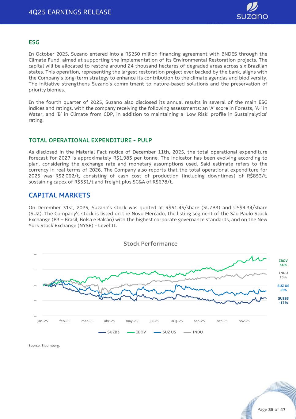 ESG In October 2025, Suzano entered into a R$250 million financing agreement with BNDES through the Climate Fund, aimed at supporting the implementation of its Environmental Restoration projects. The capital will be allocated to restore around 24 thousand hectares of degraded areas across six Brazilian states. This operation, representing the largest restoration project ever backed by the bank, aligns with the Company's long-term strategy to enhance its contribution to the climate agendas and biodiversity. The initiative strengthens Suzano’s commitment to nature-based solutions and the preservation of priority biomes. In the fourth quarter of 2025, Suzano also disclosed its annual results in several of the main ESG indices and ratings, with the company receiving the following assessments: an ‘A’ score in Forests, ‘A-’ in Water, and ‘B’ in Climate from CDP, in addition to maintaining a ‘Low Risk’ profile in Sustainalytics’ rating. TOTAL OPERATIONAL EXPENDITURE - PULP As disclosed in the Material Fact notice of December 11th, 2025, the total operational expenditure forecast for 2027 is approximately R$1,983 per tonne. The indicator has been evolving according to plan, considering the exchange rate and monetary assumptions used. Said estimate refers to the currency in real terms of 2026. The Company also reports that the total operational expenditure for 2025 was R$2,062/t, consisting of cash cost of production (including downtimes) of R$853/t, sustaining capex of R$531/t and freight plus SG&A of R$678/t. CAPITAL MARKETS On December 31st, 2025, Suzano’s stock was quoted at R$51.45/share (SUZB3) and US$9.34/share (SUZ). The Company’s stock is listed on the Novo Mercado, the listing segment of the São Paulo Stock Exchange (B3 – Brasil, Bolsa e Balcão) with the highest corporate governance standards, and on the New York Stock Exchange (NYSE) - Level II. Stock Performance SUZB3 IBOV SUZ US INDU jan-25 feb-25 mar-25 abr-25 may-25 jul-25 aug-25 sep-25 oct-25 nov-25 — — — — — Source: Bloomberg. 4Q25 EARNINGS RELEASE Page 35 of 47 SUZB3 -17% IBOV 34% INDU 13% SUZ US -8%