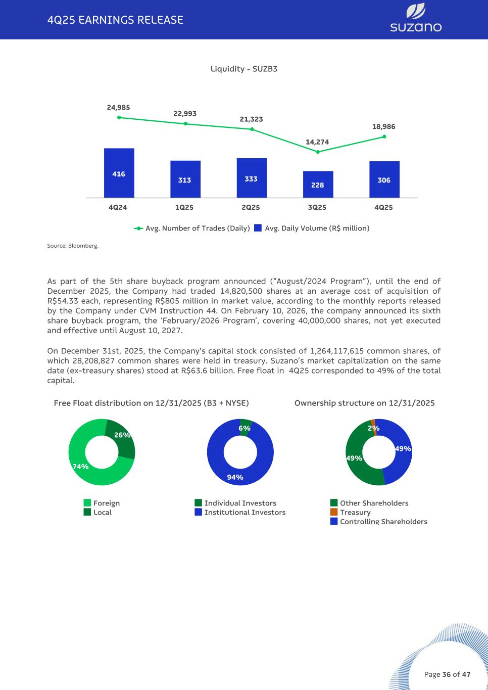 Liquidity - SUZB3 416 313 333 228 306 24,985 22,993 21,323 14,274 18,986 Avg. Number of Trades (Daily) Avg. Daily Volume (R$ million) 4Q24 1Q25 2Q25 3Q25 4Q25 Source: Bloomberg. As part of the 5th share buyback program announced (“August/2024 Program”), until the end of December 2025, the Company had traded 14,820,500 shares at an average cost of acquisition of R$54.33 each, representing R$805 million in market value, according to the monthly reports released by the Company under CVM Instruction 44. On February 10, 2026, the company announced its sixth share buyback program, the ‘February/2026 Program’, covering 40,000,000 shares, not yet executed and effective until August 10, 2027. On December 31st, 2025, the Company's capital stock consisted of 1,264,117,615 common shares, of which 28,208,827 common shares were held in treasury. Suzano’s market capitalization on the same date (ex-treasury shares) stood at R$63.6 billion. Free float in 4Q25 corresponded to 49% of the total capital. Free Float distribution on 12/31/2025 (B3 + NYSE) Ownership structure on 12/31/2025 74% 26% Foreign Local 6% 94% Individual Investors Institutional Investors 49% 2% 49% Other Shareholders Treasury Controlling Shareholders 4Q25 EARNINGS RELEASE Page 36 of 47