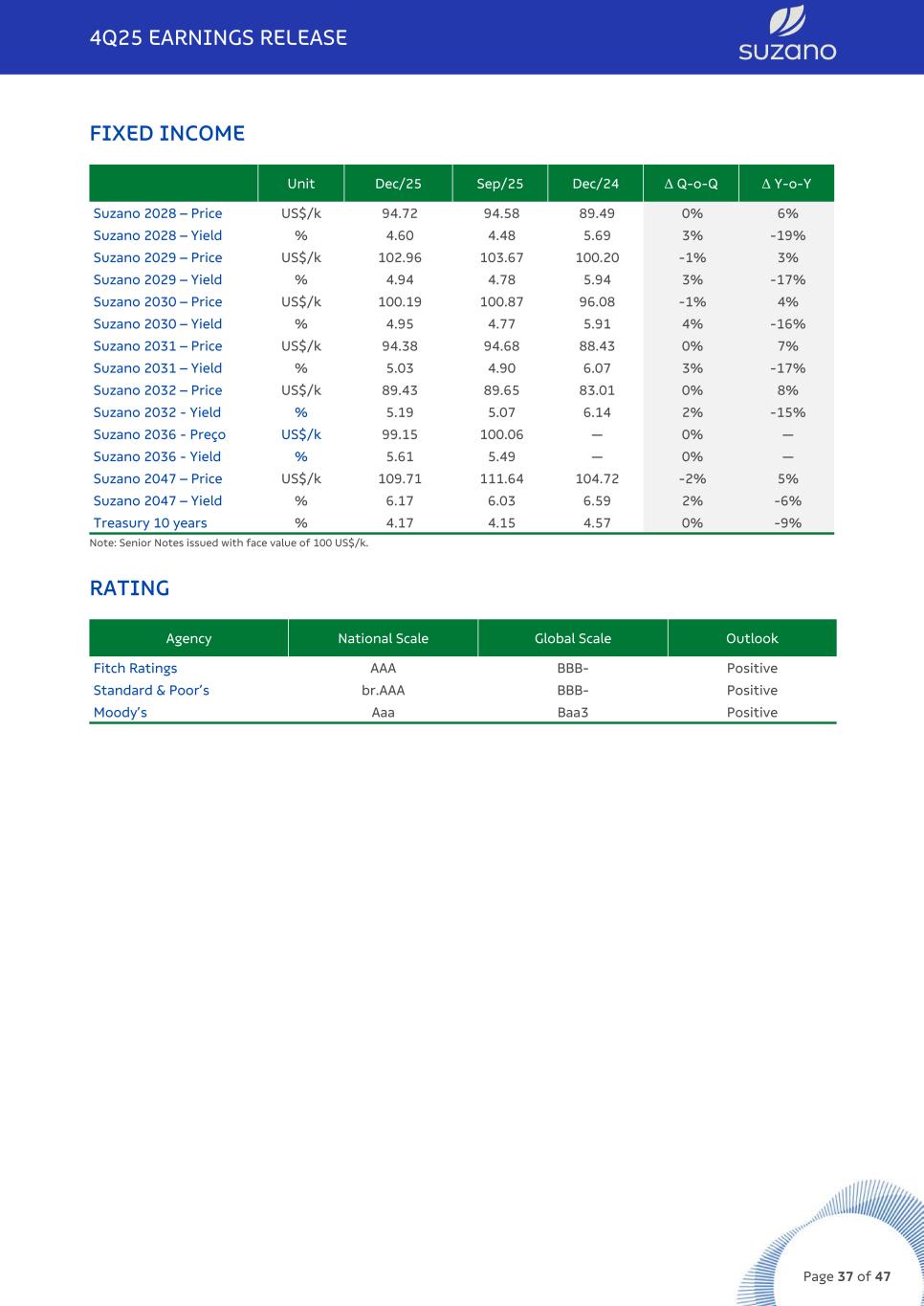 FIXED INCOME Unit Dec/25 Sep/25 Dec/24 Δ Q-o-Q Δ Y-o-Y Suzano 2028 – Price US$/k 94.72 94.58 89.49 0% 6% Suzano 2028 – Yield % 4.60 4.48 5.69 3% -19% Suzano 2029 – Price US$/k 102.96 103.67 100.20 -1% 3% Suzano 2029 – Yield % 4.94 4.78 5.94 3% -17% Suzano 2030 – Price US$/k 100.19 100.87 96.08 -1% 4% Suzano 2030 – Yield % 4.95 4.77 5.91 4% -16% Suzano 2031 – Price US$/k 94.38 94.68 88.43 0% 7% Suzano 2031 – Yield % 5.03 4.90 6.07 3% -17% Suzano 2032 – Price US$/k 89.43 89.65 83.01 0% 8% Suzano 2032 - Yield % 5.19 5.07 6.14 2% -15% Suzano 2036 - Preço US$/k 99.15 100.06 — 0% — Suzano 2036 - Yield % 5.61 5.49 — 0% — Suzano 2047 – Price US$/k 109.71 111.64 104.72 -2% 5% Suzano 2047 – Yield % 6.17 6.03 6.59 2% -6% Treasury 10 years % 4.17 4.15 4.57 0% -9% Note: Senior Notes issued with face value of 100 US$/k. RATING Agency National Scale Global Scale Outlook Fitch Ratings AAA BBB- Positive Standard & Poor’s br.AAA BBB- Positive Moody’s Aaa Baa3 Positive 4Q25 EARNINGS RELEASE Page 37 of 47