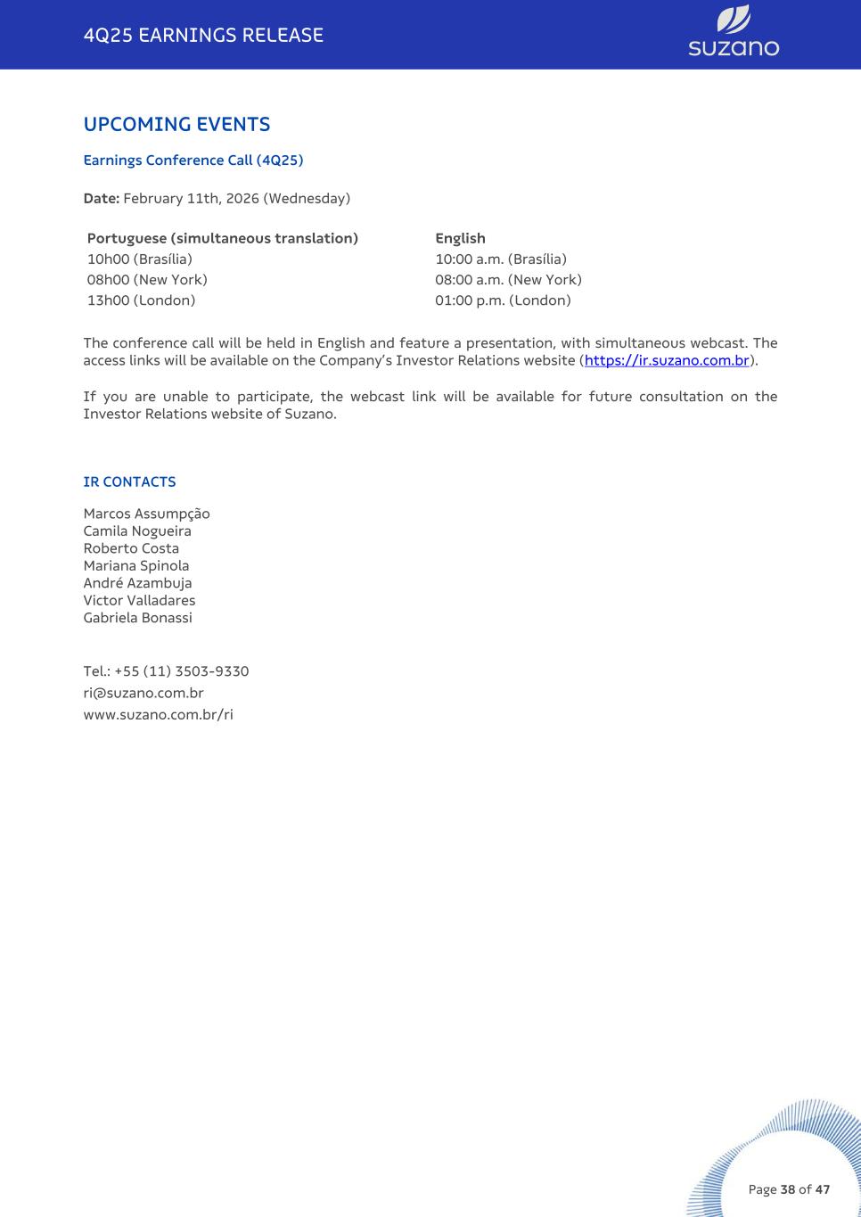 UPCOMING EVENTS Earnings Conference Call (4Q25) Date: February 11th, 2026 (Wednesday) Portuguese (simultaneous translation) English 10h00 (Brasília) 10:00 a.m. (Brasília) 08h00 (New York) 08:00 a.m. (New York) 13h00 (London) 01:00 p.m. (London) The conference call will be held in English and feature a presentation, with simultaneous webcast. The access links will be available on the Company’s Investor Relations website (https://ir.suzano.com.br). If you are unable to participate, the webcast link will be available for future consultation on the Investor Relations website of Suzano. IR CONTACTS Marcos Assumpção Camila Nogueira Roberto Costa Mariana Spinola André Azambuja Victor Valladares Gabriela Bonassi Tel.: +55 (11) 3503-9330 ri@suzano.com.br www.suzano.com.br/ri 4Q25 EARNINGS RELEASE Page 38 of 47