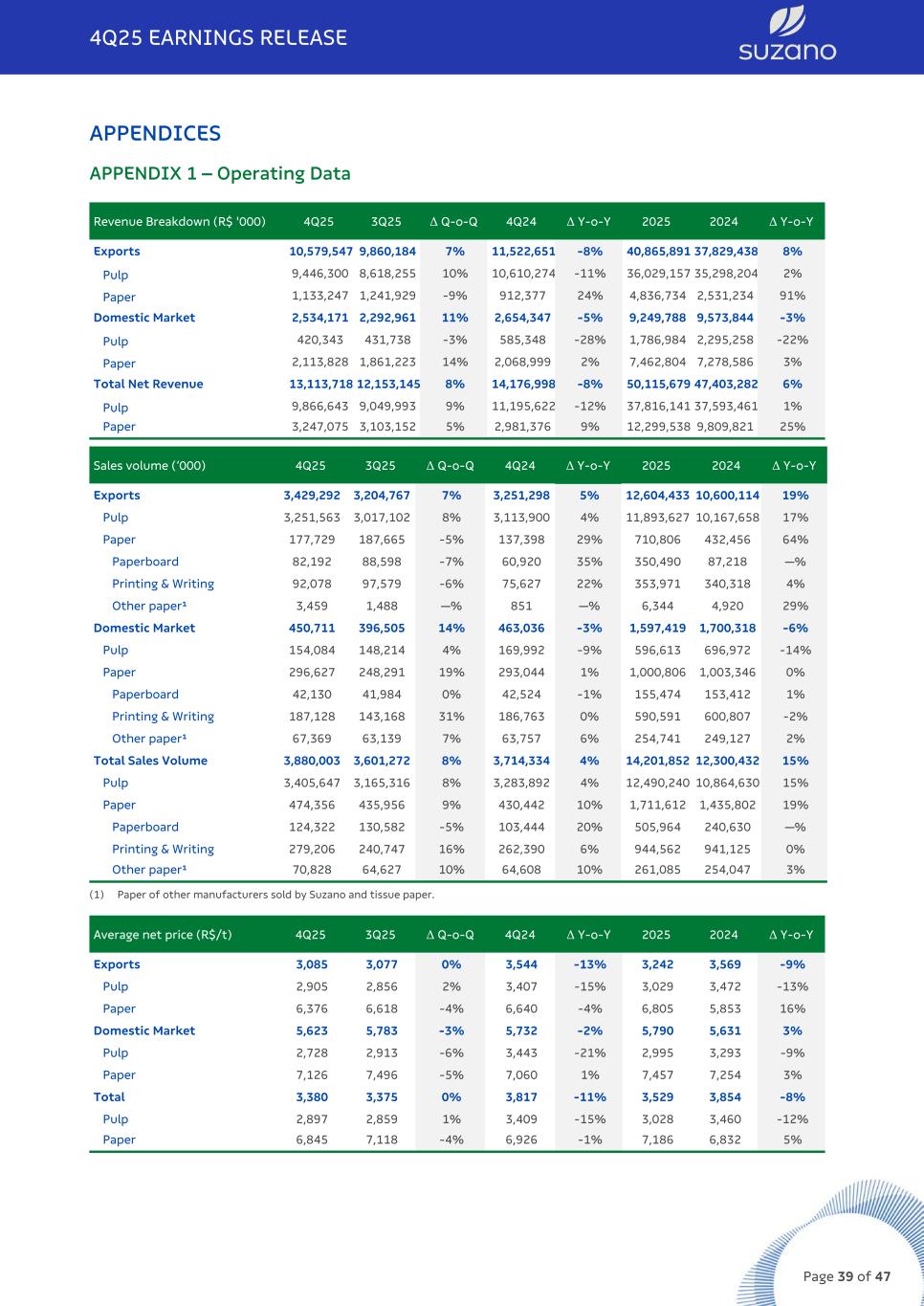 APPENDICES APPENDIX 1 – Operating Data Revenue Breakdown (R$ '000) 4Q25 3Q25 Δ Q-o-Q 4Q24 Δ Y-o-Y 2025 2024 Δ Y-o-Y Exports 10,579,547 9,860,184 7% 11,522,651 -8% 40,865,891 37,829,438 8% Pulp 9,446,300 8,618,255 10% 10,610,274 -11% 36,029,157 35,298,204 2% Paper 1,133,247 1,241,929 -9% 912,377 24% 4,836,734 2,531,234 91% Domestic Market 2,534,171 2,292,961 11% 2,654,347 -5% 9,249,788 9,573,844 -3% Pulp 420,343 431,738 -3% 585,348 -28% 1,786,984 2,295,258 -22% Paper 2,113,828 1,861,223 14% 2,068,999 2% 7,462,804 7,278,586 3% Total Net Revenue 13,113,718 12,153,145 8% 14,176,998 -8% 50,115,679 47,403,282 6% Pulp 9,866,643 9,049,993 9% 11,195,622 -12% 37,816,141 37,593,461 1% Paper 3,247,075 3,103,152 5% 2,981,376 9% 12,299,538 9,809,821 25% Sales volume (‘000) 4Q25 3Q25 Δ Q-o-Q 4Q24 Δ Y-o-Y 2025 2024 Δ Y-o-Y Exports 3,429,292 3,204,767 7% 3,251,298 5% 12,604,433 10,600,114 19% Pulp 3,251,563 3,017,102 8% 3,113,900 4% 11,893,627 10,167,658 17% Paper 177,729 187,665 -5% 137,398 29% 710,806 432,456 64% Paperboard 82,192 88,598 -7% 60,920 35% 350,490 87,218 —% Printing & Writing 92,078 97,579 -6% 75,627 22% 353,971 340,318 4% Other paper¹ 3,459 1,488 —% 851 —% 6,344 4,920 29% Domestic Market 450,711 396,505 14% 463,036 -3% 1,597,419 1,700,318 -6% Pulp 154,084 148,214 4% 169,992 -9% 596,613 696,972 -14% Paper 296,627 248,291 19% 293,044 1% 1,000,806 1,003,346 0% Paperboard 42,130 41,984 0% 42,524 -1% 155,474 153,412 1% Printing & Writing 187,128 143,168 31% 186,763 0% 590,591 600,807 -2% Other paper¹ 67,369 63,139 7% 63,757 6% 254,741 249,127 2% Total Sales Volume 3,880,003 3,601,272 8% 3,714,334 4% 14,201,852 12,300,432 15% Pulp 3,405,647 3,165,316 8% 3,283,892 4% 12,490,240 10,864,630 15% Paper 474,356 435,956 9% 430,442 10% 1,711,612 1,435,802 19% Paperboard 124,322 130,582 -5% 103,444 20% 505,964 240,630 —% Printing & Writing 279,206 240,747 16% 262,390 6% 944,562 941,125 0% Other paper¹ 70,828 64,627 10% 64,608 10% 261,085 254,047 3% (1) Paper of other manufacturers sold by Suzano and tissue paper. Average net price (R$/t) 4Q25 3Q25 Δ Q-o-Q 4Q24 Δ Y-o-Y 2025 2024 Δ Y-o-Y Exports 3,085 3,077 0% 3,544 -13% 3,242 3,569 -9% Pulp 2,905 2,856 2% 3,407 -15% 3,029 3,472 -13% Paper 6,376 6,618 -4% 6,640 -4% 6,805 5,853 16% Domestic Market 5,623 5,783 -3% 5,732 -2% 5,790 5,631 3% Pulp 2,728 2,913 -6% 3,443 -21% 2,995 3,293 -9% Paper 7,126 7,496 -5% 7,060 1% 7,457 7,254 3% Total 3,380 3,375 0% 3,817 -11% 3,529 3,854 -8% Pulp 2,897 2,859 1% 3,409 -15% 3,028 3,460 -12% Paper 6,845 7,118 -4% 6,926 -1% 7,186 6,832 5% 4Q25 EARNINGS RELEASE Page 39 of 47