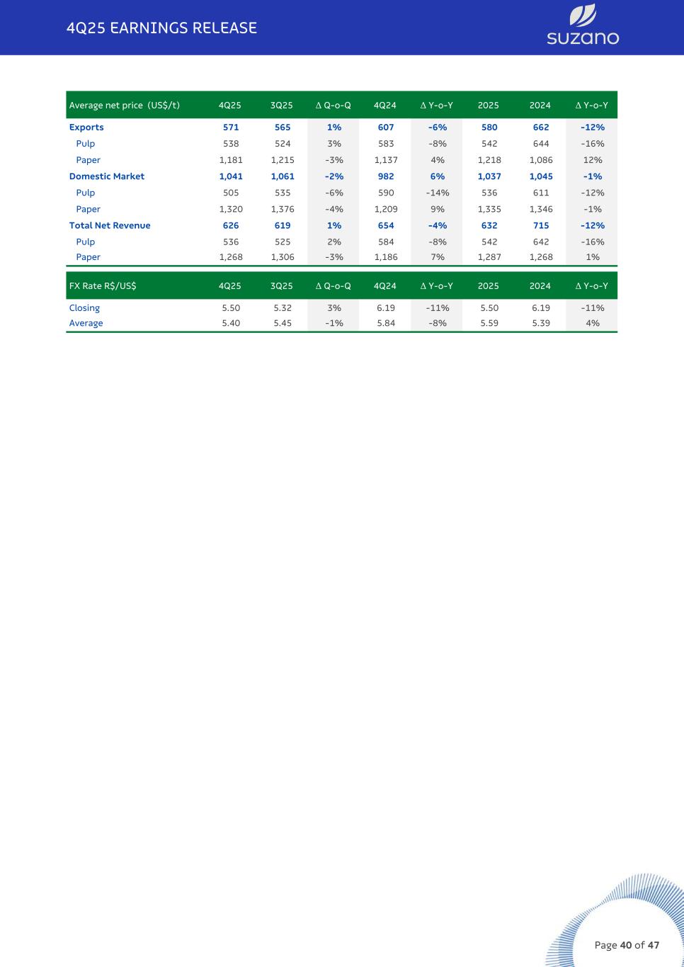 Average net price (US$/t) 4Q25 3Q25 Δ Q-o-Q 4Q24 Δ Y-o-Y 2025 2024 Δ Y-o-Y Exports 571 565 1% 607 -6% 580 662 -12% Pulp 538 524 3% 583 -8% 542 644 -16% Paper 1,181 1,215 -3% 1,137 4% 1,218 1,086 12% Domestic Market 1,041 1,061 -2% 982 6% 1,037 1,045 -1% Pulp 505 535 -6% 590 -14% 536 611 -12% Paper 1,320 1,376 -4% 1,209 9% 1,335 1,346 -1% Total Net Revenue 626 619 1% 654 -4% 632 715 -12% Pulp 536 525 2% 584 -8% 542 642 -16% Paper 1,268 1,306 -3% 1,186 7% 1,287 1,268 1% FX Rate R$/US$ 4Q25 3Q25 Δ Q-o-Q 4Q24 Δ Y-o-Y 2025 2024 Δ Y-o-Y Closing 5.50 5.32 3% 6.19 -11% 5.50 6.19 -11% Average 5.40 5.45 -1% 5.84 -8% 5.59 5.39 4% 4Q25 EARNINGS RELEASE Page 40 of 47
