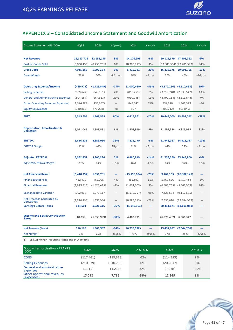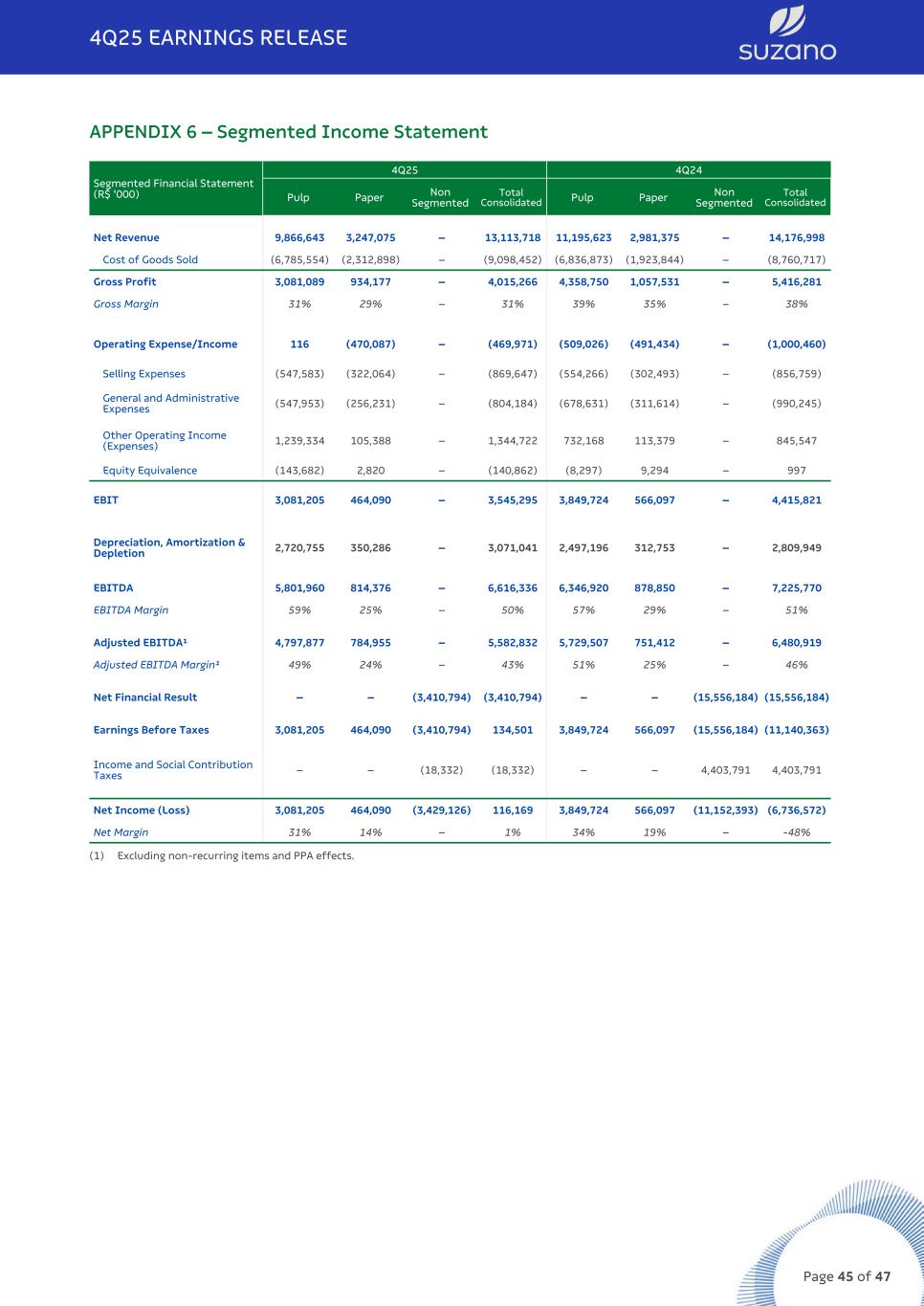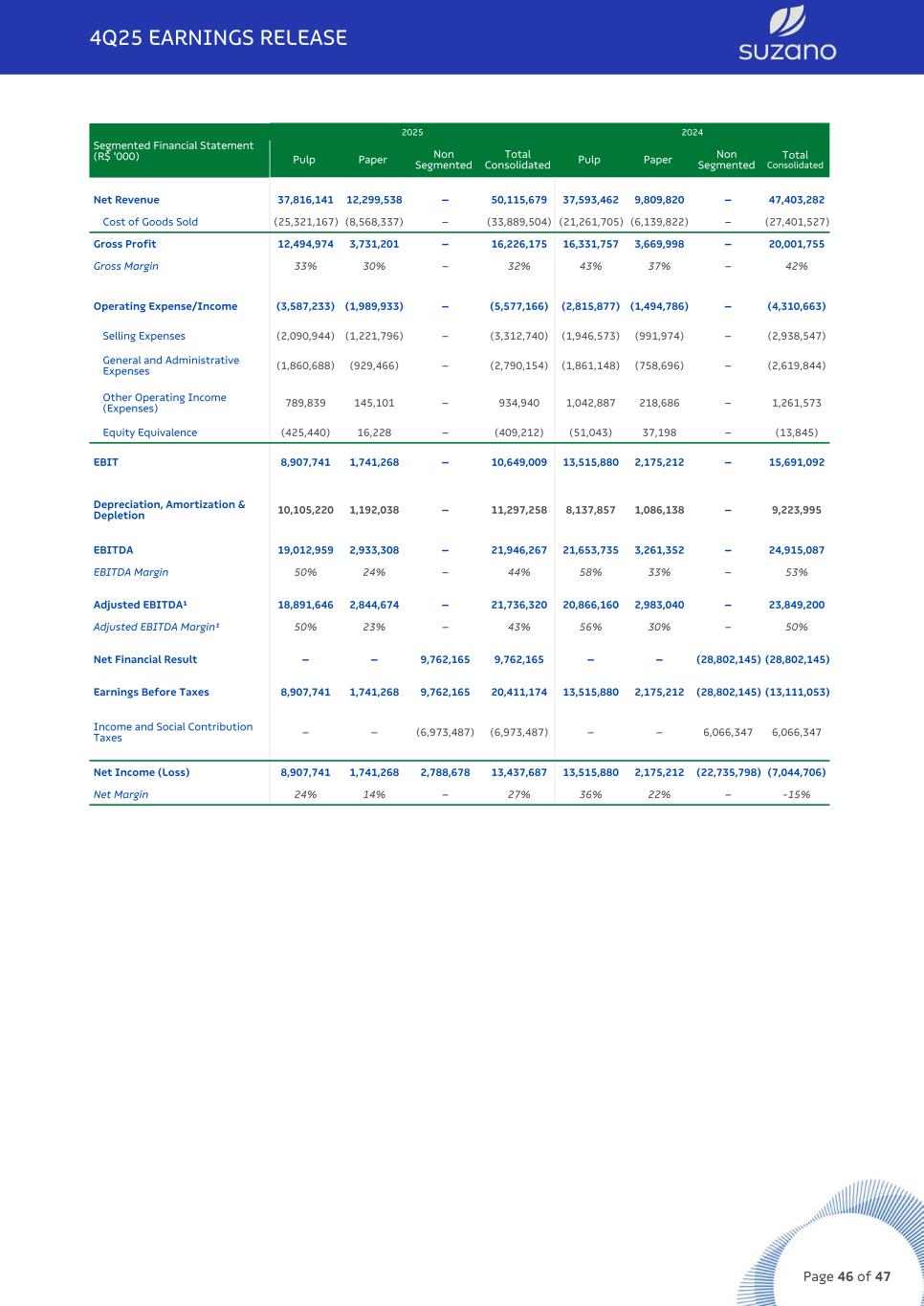 Segmented Financial Statement (R$ '000) 2025 2024 Pulp Paper Non Segmented Total Consolidated Pulp Paper Non Segmented Total Consolidated Net Revenue 37,816,141 12,299,538 – 50,115,679 37,593,462 9,809,820 – 47,403,282 Cost of Goods Sold (25,321,167) (8,568,337) – (33,889,504) (21,261,705) (6,139,822) – (27,401,527) Gross Profit 12,494,974 3,731,201 – 16,226,175 16,331,757 3,669,998 – 20,001,755 Gross Margin 33% 30% – 32% 43% 37% – 42% Operating Expense/Income (3,587,233) (1,989,933) – (5,577,166) (2,815,877) (1,494,786) – (4,310,663) Selling Expenses (2,090,944) (1,221,796) – (3,312,740) (1,946,573) (991,974) – (2,938,547) General and Administrative Expenses (1,860,688) (929,466) – (2,790,154) (1,861,148) (758,696) – (2,619,844) Other Operating Income (Expenses) 789,839 145,101 – 934,940 1,042,887 218,686 – 1,261,573 Equity Equivalence (425,440) 16,228 – (409,212) (51,043) 37,198 – (13,845) EBIT 8,907,741 1,741,268 – 10,649,009 13,515,880 2,175,212 – 15,691,092 Depreciation, Amortization & Depletion 10,105,220 1,192,038 – 11,297,258 8,137,857 1,086,138 – 9,223,995 EBITDA 19,012,959 2,933,308 – 21,946,267 21,653,735 3,261,352 – 24,915,087 EBITDA Margin 50% 24% – 44% 58% 33% – 53% Adjusted EBITDA¹ 18,891,646 2,844,674 – 21,736,320 20,866,160 2,983,040 – 23,849,200 Adjusted EBITDA Margin¹ 50% 23% – 43% 56% 30% – 50% Net Financial Result – – 9,762,165 9,762,165 – – (28,802,145) (28,802,145) Earnings Before Taxes 8,907,741 1,741,268 9,762,165 20,411,174 13,515,880 2,175,212 (28,802,145) (13,111,053) Income and Social Contribution Taxes – – (6,973,487) (6,973,487) – – 6,066,347 6,066,347 Net Income (Loss) 8,907,741 1,741,268 2,788,678 13,437,687 13,515,880 2,175,212 (22,735,798) (7,044,706) Net Margin 24% 14% – 27% 36% 22% – -15% 4Q25 EARNINGS RELEASE Page 46 of 47