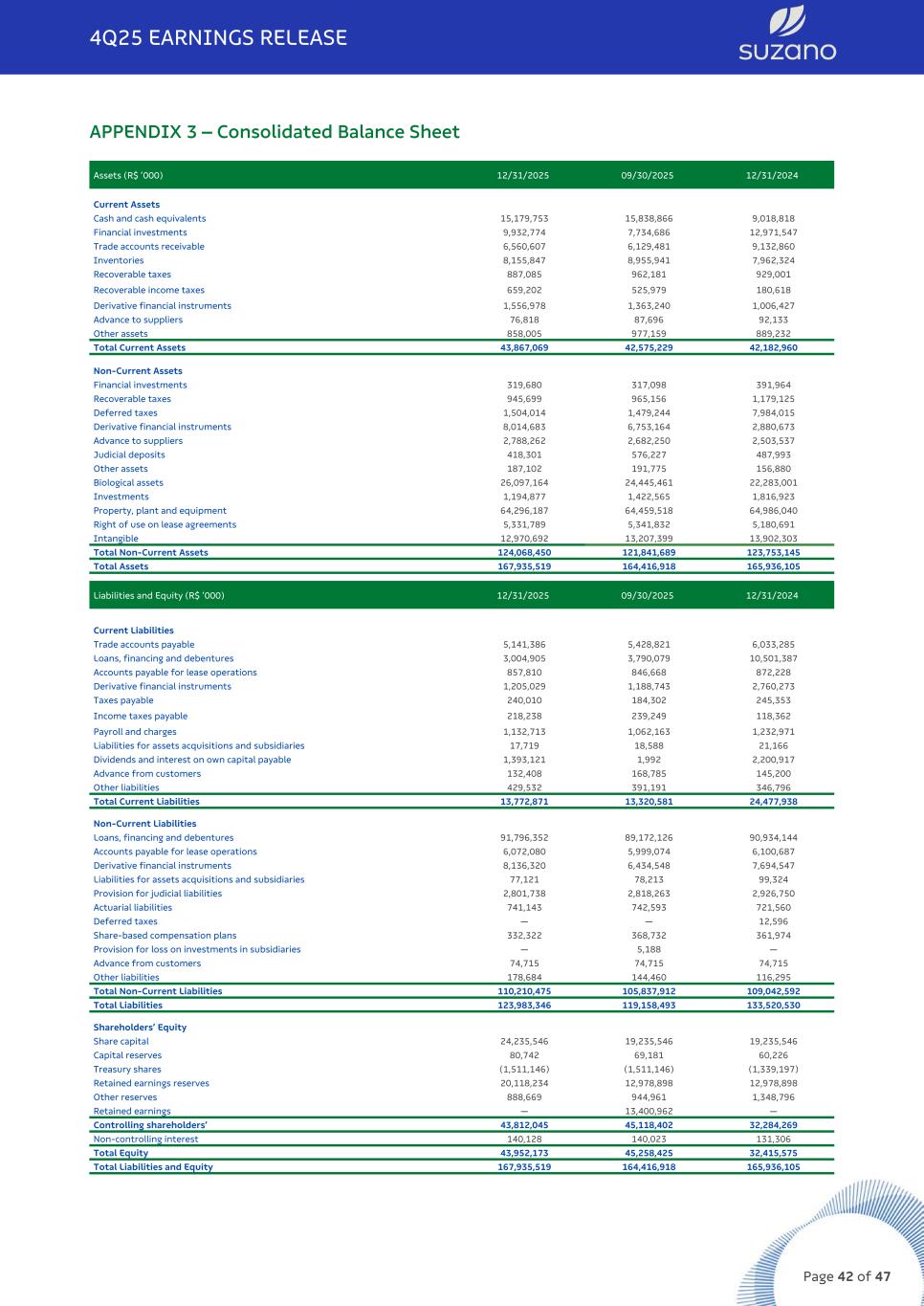APPENDIX 3 – Consolidated Balance Sheet Assets (R$ ’000) 12/31/2025 09/30/2025 12/31/2024 Current Assets Cash and cash equivalents 15,179,753 15,838,866 9,018,818 Financial investments 9,932,774 7,734,686 12,971,547 Trade accounts receivable 6,560,607 6,129,481 9,132,860 Inventories 8,155,847 8,955,941 7,962,324 Recoverable taxes 887,085 962,181 929,001 Recoverable income taxes 659,202 525,979 180,618 Derivative financial instruments 1,556,978 1,363,240 1,006,427 Advance to suppliers 76,818 87,696 92,133 Other assets 858,005 977,159 889,232 Total Current Assets 43,867,069 42,575,229 42,182,960 Non-Current Assets Financial investments 319,680 317,098 391,964 Recoverable taxes 945,699 965,156 1,179,125 Deferred taxes 1,504,014 1,479,244 7,984,015 Derivative financial instruments 8,014,683 6,753,164 2,880,673 Advance to suppliers 2,788,262 2,682,250 2,503,537 Judicial deposits 418,301 576,227 487,993 Other assets 187,102 191,775 156,880 Biological assets 26,097,164 24,445,461 22,283,001 Investments 1,194,877 1,422,565 1,816,923 Property, plant and equipment 64,296,187 64,459,518 64,986,040 Right of use on lease agreements 5,331,789 5,341,832 5,180,691 Intangible 12,970,692 13,207,399 13,902,303 Total Non-Current Assets 124,068,450 121,841,689 123,753,145 Total Assets 167,935,519 164,416,918 165,936,105 Liabilities and Equity (R$ ’000) 12/31/2025 09/30/2025 12/31/2024 Current Liabilities Trade accounts payable 5,141,386 5,428,821 6,033,285 Loans, financing and debentures 3,004,905 3,790,079 10,501,387 Accounts payable for lease operations 857,810 846,668 872,228 Derivative financial instruments 1,205,029 1,188,743 2,760,273 Taxes payable 240,010 184,302 245,353 Income taxes payable 218,238 239,249 118,362 Payroll and charges 1,132,713 1,062,163 1,232,971 Liabilities for assets acquisitions and subsidiaries 17,719 18,588 21,166 Dividends and interest on own capital payable 1,393,121 1,992 2,200,917 Advance from customers 132,408 168,785 145,200 Other liabilities 429,532 391,191 346,796 Total Current Liabilities 13,772,871 13,320,581 24,477,938 Non-Current Liabilities Loans, financing and debentures 91,796,352 89,172,126 90,934,144 Accounts payable for lease operations 6,072,080 5,999,074 6,100,687 Derivative financial instruments 8,136,320 6,434,548 7,694,547 Liabilities for assets acquisitions and subsidiaries 77,121 78,213 99,324 Provision for judicial liabilities 2,801,738 2,818,263 2,926,750 Actuarial liabilities 741,143 742,593 721,560 Deferred taxes — — 12,596 Share-based compensation plans 332,322 368,732 361,974 Provision for loss on investments in subsidiaries — 5,188 — Advance from customers 74,715 74,715 74,715 Other liabilities 178,684 144,460 116,295 Total Non-Current Liabilities 110,210,475 105,837,912 109,042,592 Total Liabilities 123,983,346 119,158,493 133,520,530 Shareholders’ Equity Share capital 24,235,546 19,235,546 19,235,546 Capital reserves 80,742 69,181 60,226 Treasury shares (1,511,146) (1,511,146) (1,339,197) Retained earnings reserves 20,118,234 12,978,898 12,978,898 Other reserves 888,669 944,961 1,348,796 Retained earnings — 13,400,962 — Controlling shareholders’ 43,812,045 45,118,402 32,284,269 Non-controlling interest 140,128 140,023 131,306 Total Equity 43,952,173 45,258,425 32,415,575 Total Liabilities and Equity 167,935,519 164,416,918 165,936,105 4Q25 EARNINGS RELEASE Page 42 of 47