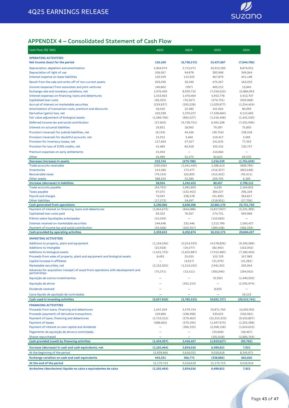 APPENDIX 4 – Consolidated Statement of Cash Flow OPERATING ACTIVITIES Net income (loss) for the period 116,169 (6,736,572) 13,437,687 (7,044,706) Depreciation, depletion and amortization 2,964,974 2,715,071 10,913,290 8,874,931 Depreciation of right of use 106,067 94,878 383,968 349,064 Interest expense on lease liabilities 120,559 115,925 467,879 451,148 Result from the sale and write-off of non-current assets 203,039 30,340 475,267 163,033 Income (expense) from associates and joint ventures 140,862 (997) 409,212 13,845 Exchange rate and monetary variations, net 1,976,459 8,929,715 (7,550,610) 15,884,993 Interest expenses on financing, loans and debentures 1,553,963 1,470,404 5,953,778 5,413,707 Capitalized loan costs (69,322) (76,567) (274,731) (959,968) Accrual of interest on marketable securities (259,937) (295,228) (1,029,877) (1,254,424) Amortization of transaction costs, premium and discounts 26,010 22,383 101,926 80,099 Derivative (gains) loss, net 102,938 5,370,257 (7,328,684) 9,112,683 Fair value adjustment of biological assets (1,589,706) (892,527) (1,516,458) (1,431,530) Deferred income tax and social contribution (27,605) (4,728,751) 6,455,108 (7,431,946) Interest on actuarial liabilities 19,821 18,962 79,287 75,850 Provision (reversal) for judicial liabilities, net (8,134) 44,166 (49,754) 138,318 Provision (reversal) for doubtful accounts, net 15,915 3,460 119,417 2,585 Provision for inventory losses, net 117,604 57,557 141,635 77,353 Provision for loss of ICMS credits, net 41,483 82,918 193,152 130,727 Premium expenses on early settlements 21,034 — 110,060 — Other 26,989 52,275 92,622 69,535 Decrease (increase) in assets 533,724 (679,788) 1,216,539 (1,761,659) Trade accounts receivable (290,026) (1,041,445) 1,586,613 (808,785) Inventories 514,580 173,477 (216,357) (863,648) Recoverable taxes (79,154) 165,895 (413,422) (95,411) Other assets 388,324 22,285 259,705 6,185 Increase (decrease) in liabilities 58,054 1,242,425 80,457 2,798,112 Trade accounts payable (94,792) 1,081,803 6,630 2,164,832 Taxes payable 97,072 (132,453) 384,227 296,169 Payroll and charges 73,047 238,378 (91,499) 364,817 Other liabilities (17,273) 54,697 (218,901) (27,706) Cash generated from operations 6,190,960 6,840,306 22,881,170 23,751,750 Payment of interest on financing, loans and debentures (1,064,675) (844,088) (5,817,907) (5,241,389) Capitalized loan costs paid 69,322 76,567 274,731 959,968 Prêmio sobre liquidações antecipadas (21,034) — (110,060) — Interest received on marketable securities 244,648 232,446 1,213,789 1,500,437 Payment of income tax and social contribution (59,568) (102,357) (289,548) (366,339) Cash provided by operating activities 5,359,653 6,202,874 18,152,175 20,604,427 INVESTING ACTIVITIES Additions to property, plant and equipment (1,154,256) (2,014,333) (4,578,826) (9,190,589) Additions to intangible (22,918) (19,277) (82,492) (162,042) Additions to biological assets (1,631,733) (1,822,887) (7,913,483) (7,180,450) Proceeds from sales of property, plant and equipment and biological assets 8,493 55,055 122,729 167,983 Capital increase in affiliates — (4,017) (21,979) (41,281) Marketable securities, net (2,152,025) (1,514,192) 2,941,921 205,954 Advances for acquisition (receipt) of wood from operations with development and partnerships (75,371) (13,511) (300,040) (294,952) Aquisição de outros investimentos — — (9,392) (1,440,503) Aquisição de ativos — (452,153) — (2,595,974) Dividends received — — 8,835 — Caixa líquido de aquisição de controladas — — — 19,113 Cash used in investing activities (5,027,810) (5,785,315) (9,832,727) (20,512,741) FINANCING ACTIVITIES Proceeds from loans, financing and debentures 1,547,204 3,579,754 23,871,760 15,692,905 Proceeds (payment) of derivative transactions 159,866 (198,308) 530,655 (550,581) Payment of loans, financing and debentures (2,753,312) (279,463) (22,353,325) (9,410,807) Payment of leases (388,065) (379,193) (1,447,973) (1,325,398) Payment of interest on own capital and dividends — (306,333) (2,208,158) (1,624,653) Pagamento de aquisição de ativos e controladas — — (20,668) (58,467) Shares repurchased — — (191,918) (2,806,764) Cash provided (used) by financing activities (1,434,307) 2,416,457 (1,819,627) (83,765) Increase (decrease) in cash and cash equivalents, net (1,102,464) 2,834,016 6,499,821 7,921 At the beginning of the period 15,838,866 5,818,031 9,018,818 8,345,871 Exchange variation on cash and cash equivalents 443,351 366,771 (338,886) 665,026 At the end of the period 15,179,753 9,018,818 15,179,753 9,018,818 Acréscimo (decréscimo) líquido no caixa e equivalentes de caixa (1,102,464) 2,834,016 6,499,821 7,921 Cash Flow (R$ ’000) 4Q25 4Q24 2025 2024 4Q25 EARNINGS RELEASE Page 43 of 47