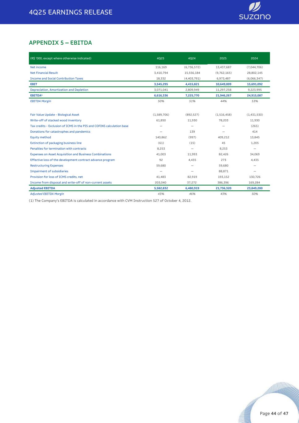 APPENDIX 5 – EBITDA (R$ '000, except where otherwise indicated) 4Q25 4Q24 2025 2024 Net income 116,169 (6,736,572) 13,437,687 (7,044,706) Net Financial Result 3,410,794 15,556,184 (9,762,165) 28,802,145 Income and Social Contribution Taxes 18,332 (4,403,791) 6,973,487 (6,066,347) EBIT 3,545,295 4,415,821 10,649,009 15,691,092 Depreciation, Amortization and Depletion 3,071,041 2,809,949 11,297,258 9,223,995 EBITDA¹ 6,616,336 7,225,770 21,946,267 24,915,087 EBITDA Margin 50% 51% 44% 53% Fair Value Update - Biological Asset (1,589,706) (892,527) (1,516,458) (1,431,530) Write-off of stacked wood inventory 61,850 11,930 78,203 11,930 Tax credits - Exclusion of ICMS in the PIS and COFINS calculation base — — — (265) Donations for catastrophes and pandemics — 139 — 414 Equity method 140,862 (997) 409,212 13,845 Extinction of packaging business line (61) (15) 45 1,205 Penalties for termination with contracts 8,253 — 8,253 — Expenses on Asset Acquisition and Business Combinations 41,003 11,993 82,426 34,069 Effective loss of the development contract advance program 92 4,435 273 4,435 Restructuring Expenses 59,680 — 59,680 — Impairment of subsidiaries — — 88,871 — Provision for loss of ICMS credits, net 41,483 82,919 193,152 130,726 Income from disposal and write-off of non-current assets 203,040 37,272 386,396 169,284 Adjusted EBITDA 5,582,832 6,480,919 21,736,320 23,849,200 Adjusted EBITDA Margin 43% 46% 43% 50% (1) The Company's EBITDA is calculated in accordance with CVM Instruction 527 of October 4, 2012. 4Q25 EARNINGS RELEASE Page 44 of 47