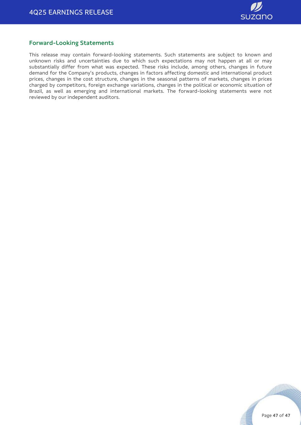 Forward-Looking Statements This release may contain forward-looking statements. Such statements are subject to known and unknown risks and uncertainties due to which such expectations may not happen at all or may substantially differ from what was expected. These risks include, among others, changes in future demand for the Company’s products, changes in factors affecting domestic and international product prices, changes in the cost structure, changes in the seasonal patterns of markets, changes in prices charged by competitors, foreign exchange variations, changes in the political or economic situation of Brazil, as well as emerging and international markets. The forward-looking statements were not reviewed by our independent auditors. 4Q25 EARNINGS RELEASE Page 47 of 47