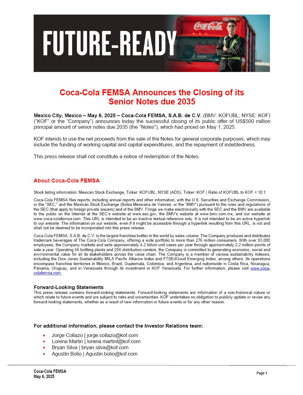 Coca-Cola FEMSA Announces the Closing of its Senior Notes due 2035 Mexico City, Mexico – May 6, 2025 – Coca-Cola FEMSA, S.A.B. de C.V. (BMV: KOFUBL; NYSE: KOF) (“KOF” or the “Company”) announces today the successful closing of its public offer of US$500 million principal amount of senior notes due 2035 (the “Notes”), which had priced on May 1, 2025. KOF intends to use the net proceeds from the sale of the Notes for general corporate purposes, which may include the funding of working capital and capital expenditures, and the repayment of indebtedness. This press release shall not constitute a notice of redemption of the Notes. About Coca-Cola FEMSA Stock listing information: Mexican Stock Exchange, Ticker: KOFUBL, NYSE (ADS), Ticker: KOF | Ratio of KOFUBL to KOF = 10:1 Coca-Cola FEMSA files reports, including annual reports and other information, with the U.S. Securities and Exchange Commission, or the “SEC,” and the Mexican Stock Exchange (Bolsa Mexicana de Valores, or the “BMV”) pursuant to the rules and regulations of the SEC (that apply to foreign private issuers) and of the BMV. Filings we make electronically with the SEC and the BMV are available to the public on the Internet at the SEC’s website at www.sec.gov, the BMV’s website at www.bmv.com.mx, and our website at www.coca-colafemsa.com. This URL is intended to be an inactive textual reference only. It is not intended to be an active hyperlink to our website. The information on our website, even if it might be accessible through a hyperlink resulting from this URL, is not and shall not be deemed to be incorporated into this press release. Coca-Cola FEMSA, S.A.B. de C.V. is the largest franchise bottler in the world by sales volume. The Company produces and distributes trademark beverages of The Coca-Cola Company, offering a wide portfolio to more than 276 million consumers. With over 93,000 employees, the Company markets and sells approximately 4.2 billion unit cases per year through approximately 2.2 million points of sale a year. Operating 56 bottling plants and 256 distribution centers, the Company is committed to generating economic, social and environmental value for all its stakeholders across the value chain. The Company is a member of various sustainability indexes, including the Dow Jones Sustainability MILA Pacific Alliance Index and FTSE4Good Emerging Index, among others. Its operations encompass franchise territories in Mexico, Brazil, Guatemala, Colombia, and Argentina, and nationwide in Costa Rica, Nicaragua, Panama, Uruguay, and in Venezuela through its investment in KOF Venezuela. For further information, please visit www.coca-colafemsa.com. Forward-Looking Statements This press release contains forward-looking statements. Forward-looking statements are information of a non-historical nature or which relate to future events and are subject to risks and uncertainties. KOF undertakes no obligation to publicly update or revise any forward-looking statements, whether as a result of new information or future events or for any other reason. For additional information, please contact the Investor Relations team: • Jorge Collazo | jorge.collazo@kof.com • Lorena Martin | lorena.martinl@kof.com • Bryan Silva | bryan.silva@kof.com • Agustín Bolio | Agustin.bolio@kof.com
