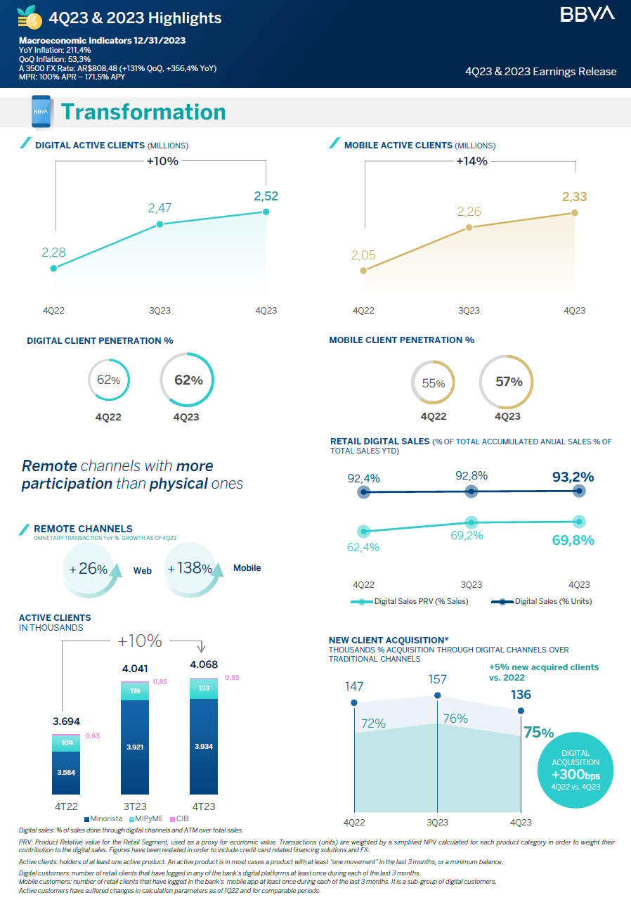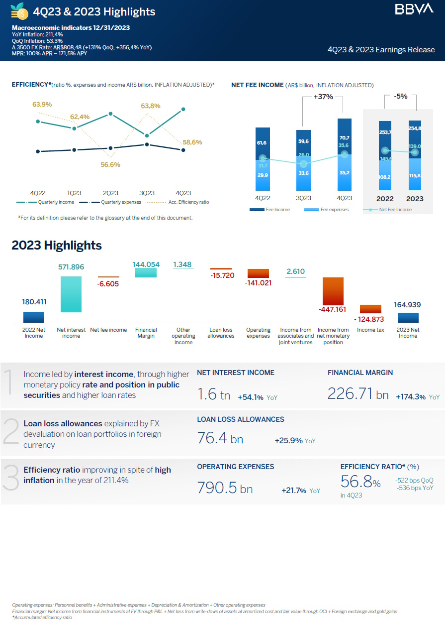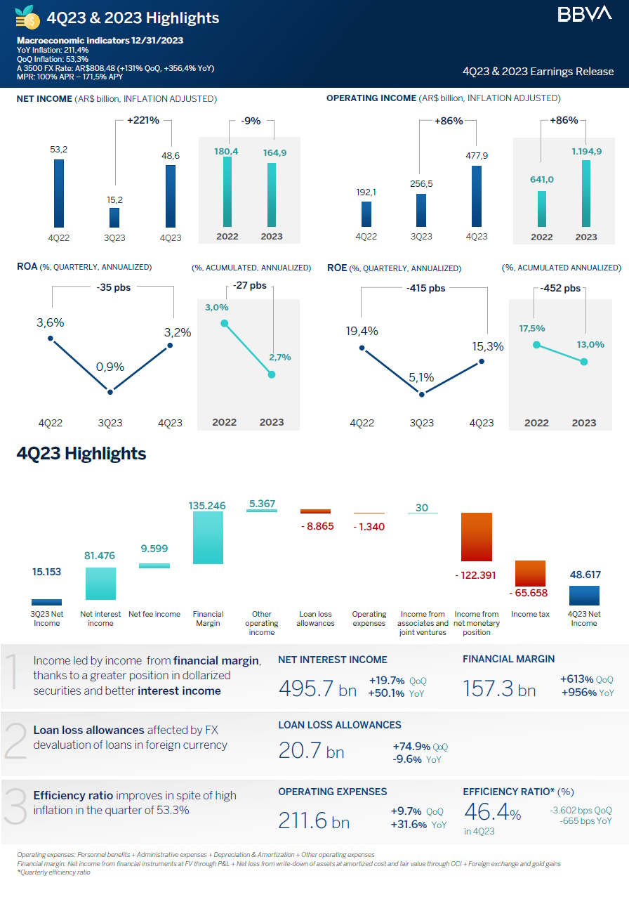 ·BBVA Argentina’s inflation adjusted net income in 4Q23 was $48.6 billion, 220.8% higher than the $15.2 billion reported on the third quarter of 2023 (3Q23), and 8.7% lower than the $53.2 billion reported on the fourth quarter of 2022 (4Q22). BBVA Argentina’s inflation adjusted net income for the twelve months of 2023 totaled $164.9 billion, 8.6% lower than the $180.4 billion reported in the twelve months of 2022.