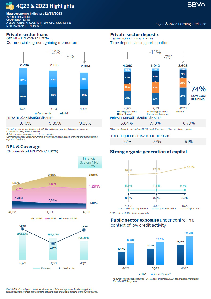 ·In 4Q23, BBVA Argentina posted an inflation adjusted average return on assets (ROAA) of 3.2% and an inflation adjusted average return on equity (ROAE) of 15.3%. In 2023, BBVA Argentina posted an inflation adjusted ROAA of 2.7% and an inflation adjusted ROAE of 13.0%.