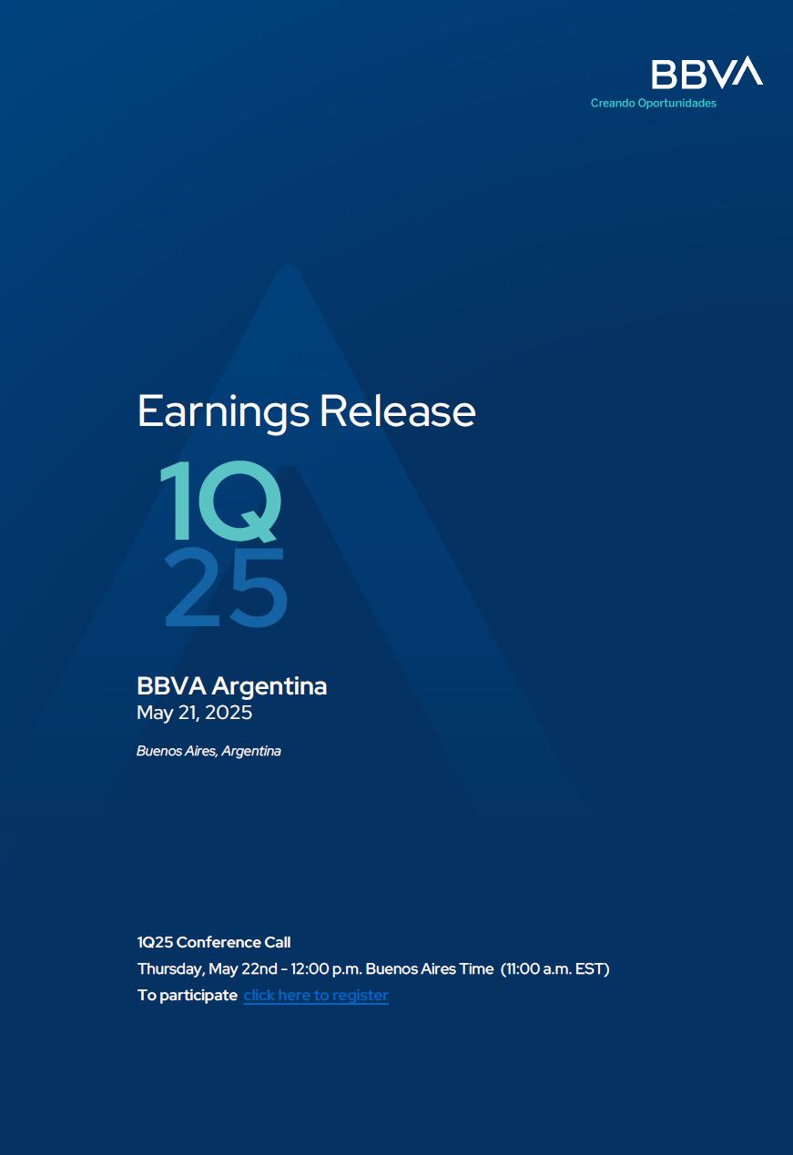 Buenos Aires, May 21, 2025 – Banco BBVA Argentina S.A (NYSE; BYMA; MAE: BBAR; LATIBEX: XBBAR) (“BBVA Argentina” or “BBVA” or “the Bank”) announced today its consolidated results for the first quarter (1Q25), ended on March 31, 2025.