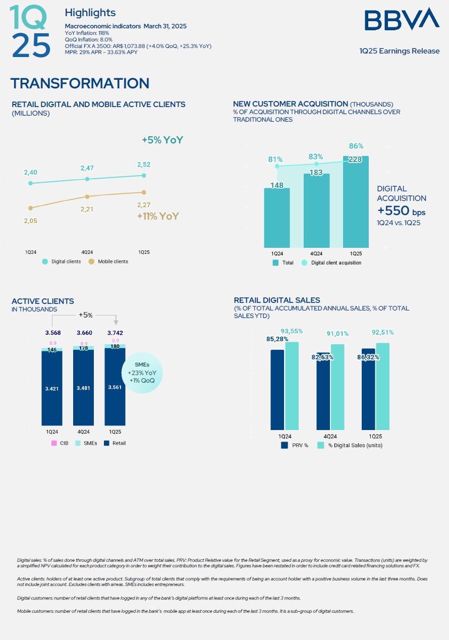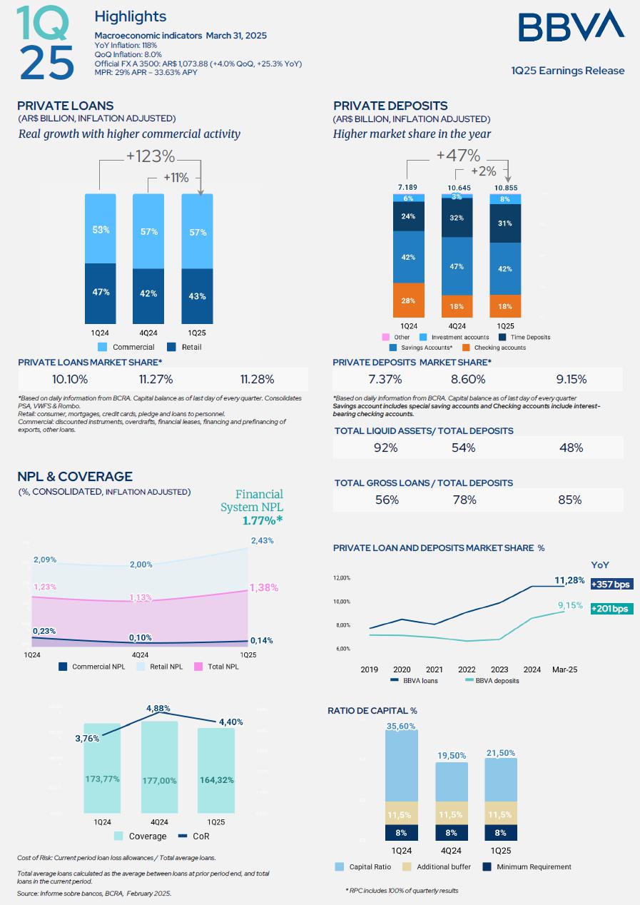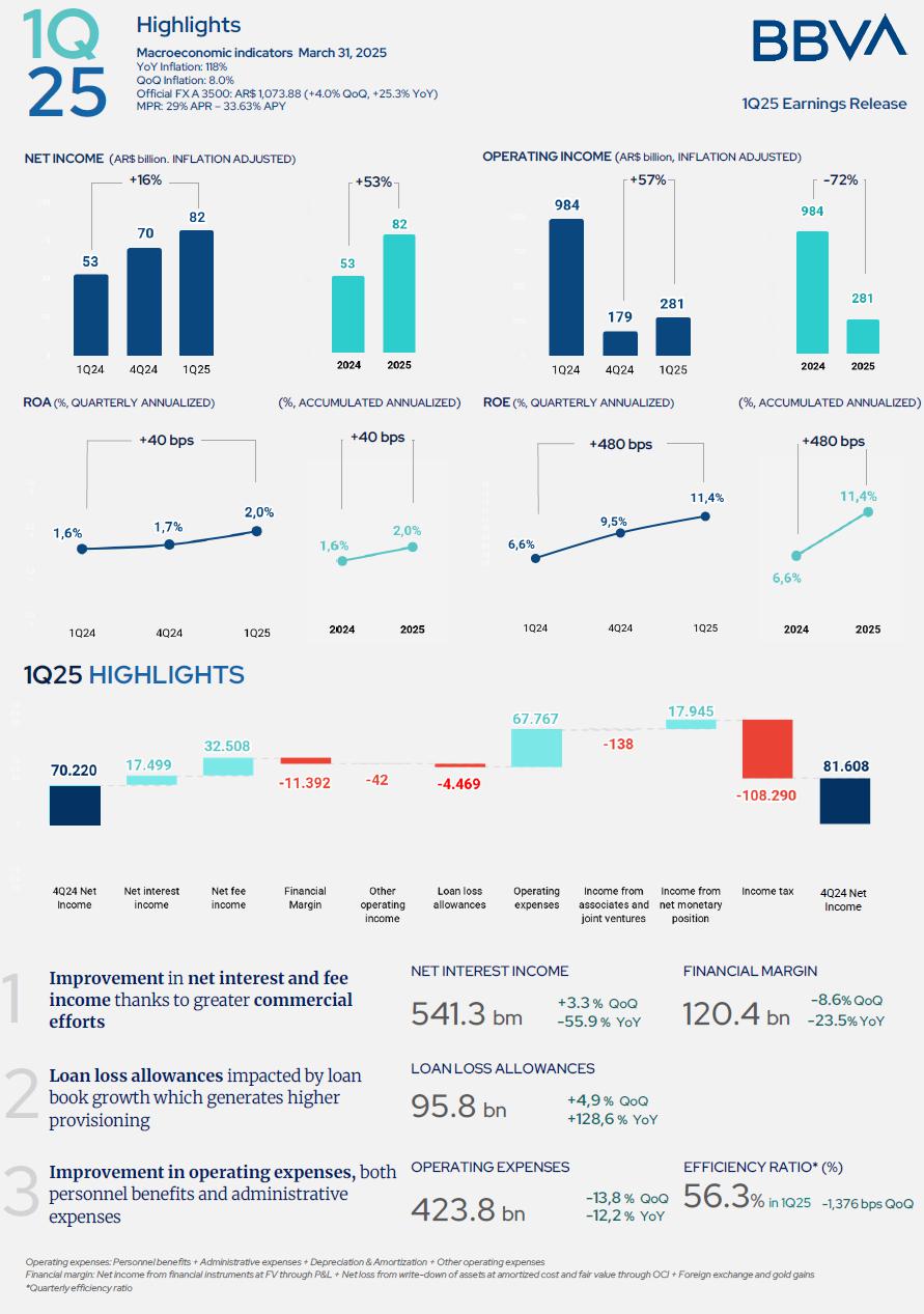 ·BBVA Argentina’s inflation adjusted net income in 1Q25 was $81.6 billion, 16.2% above the $70.2 billion reported on the fourth quarter of 2024 (4Q24), and 53.2% higher than the $53.3 billion reported on the first quarter of 2024 (1Q24).