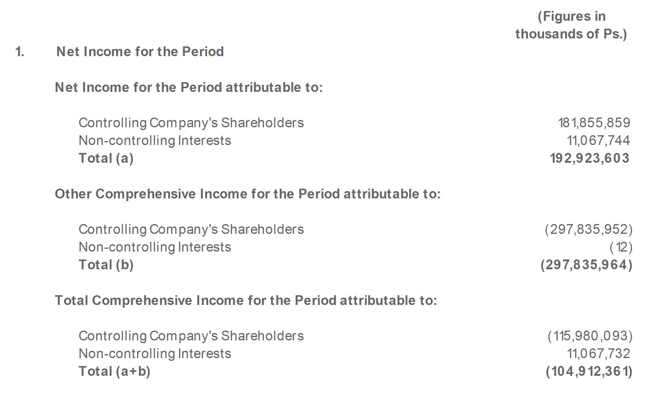 (Figures in thousands of Ps.) 1. Net Income for the Period Net Income for the Period attributable to: Controlling Company's Shareholders 181,855,859 Non-controlling Interests 11,067,744 Total (a) 192,923,603 Other Comprehensive Income for the Period attributable to: Controlling Company's Shareholders (297,835,952) Non-controlling Interests (12) Total (b) (297,835,964) Total Comprehensive Income for the Period attributable to: Controlling Company's Shareholders (115,980,093) Non-controlling Interests 11,067,732 Total (a+b) (104,912,361)