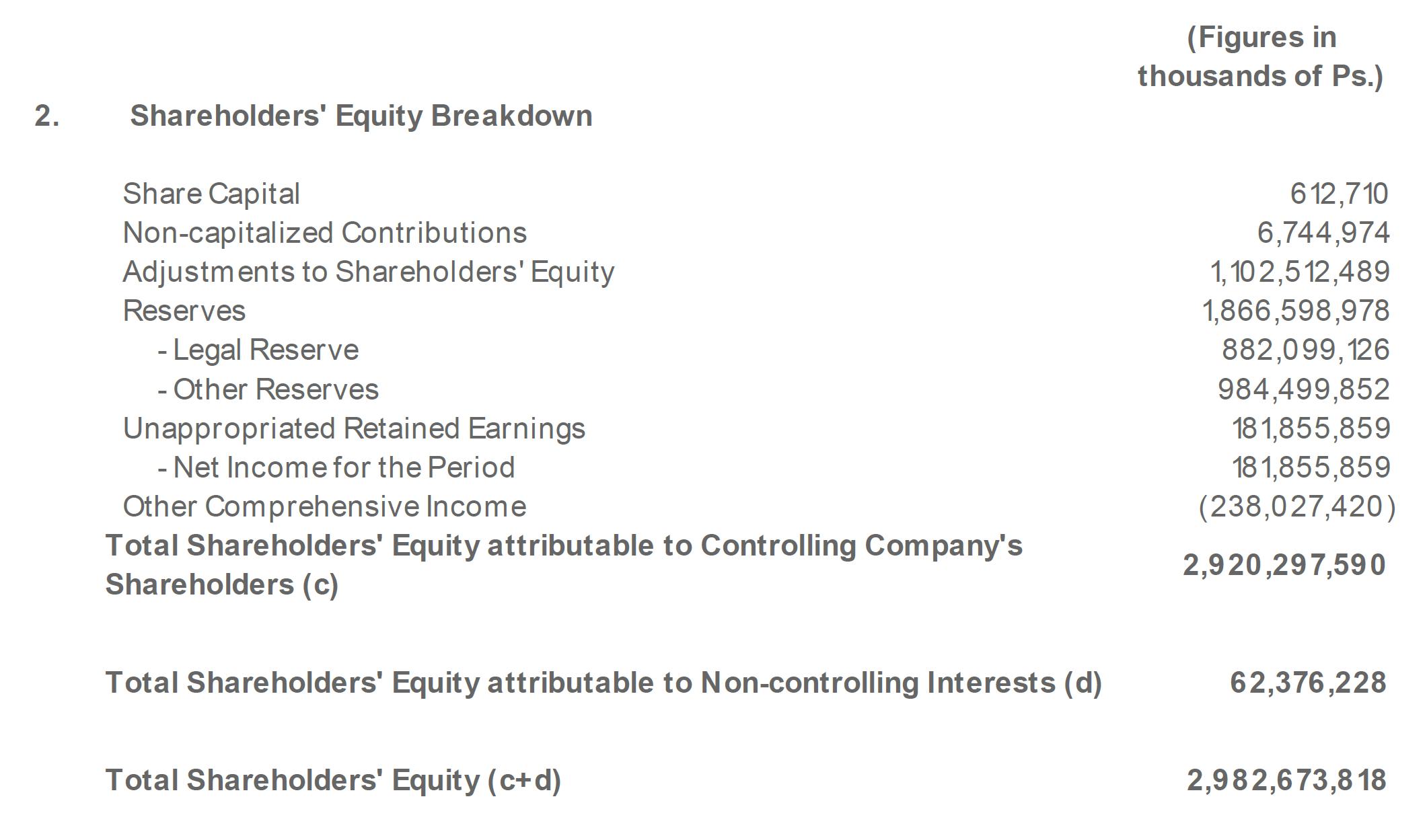 (Figures in thousands of Ps.) 2. Shareholders' Equity Breakdown Share Capital 612,710 Non-capitalized Contributions 6,744,974 Adjustments to Shareholders' Equity 1,102,512,489 Reserves 1,866,598,978 - Legal Reserve 882,099,126 - Other Reserves 984,499,852 Unappropriated Retained Earnings 181,855,859 - Net Income for the Period 181,855,859 Other Comprehensive Income (238,027,420) Total Shareholders' Equity attributable to Controlling Company's Shareholders (c) 2,920,297,590 Total Shareholders' Equity attributable to Non-controlling Interests (d) 62,376,228 Total Shareholders' Equity (c+d) 2,982,673,818