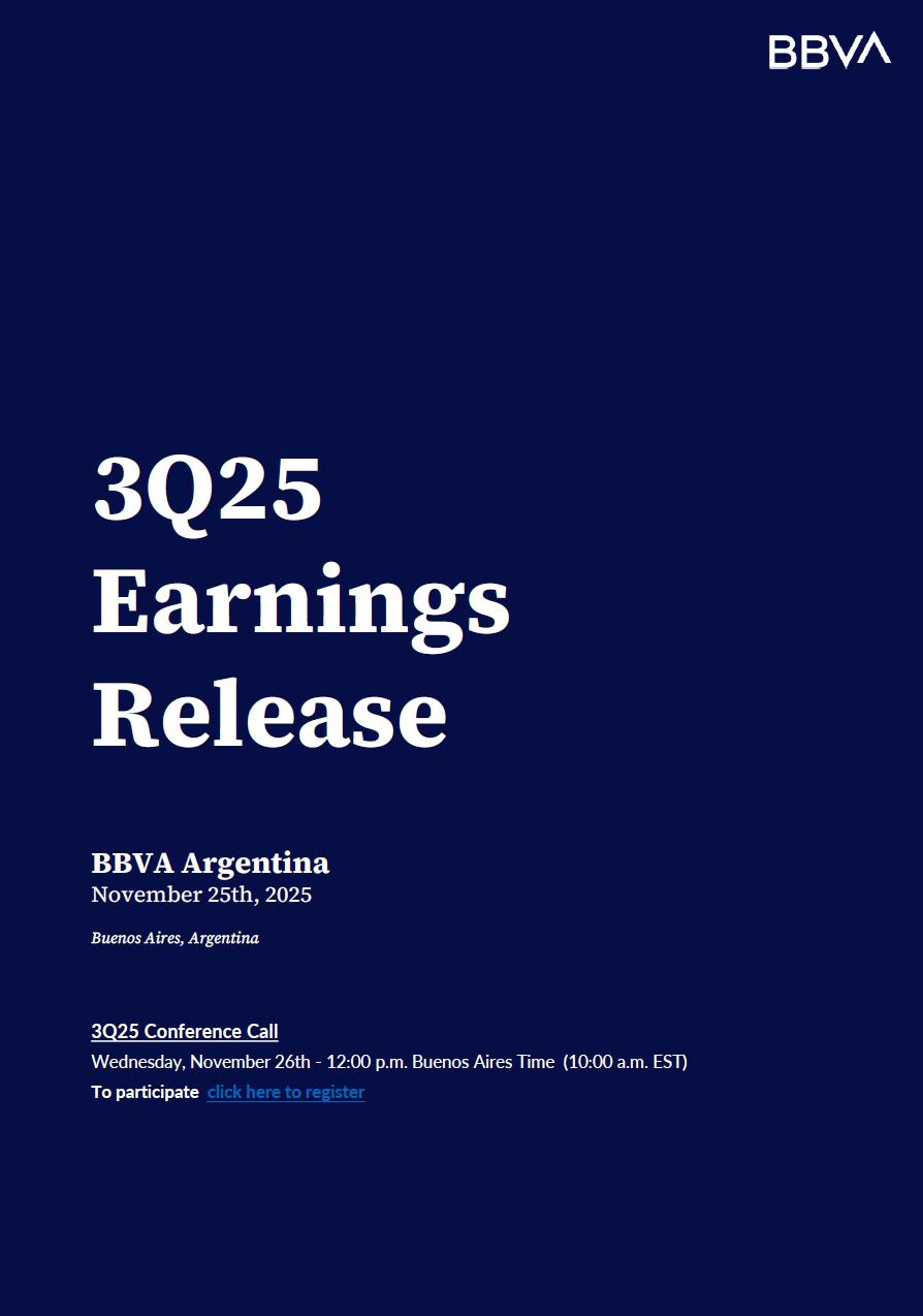 Buenos Aires, November 25, 2025 – Banco BBVA Argentina S.A (NYSE; BYMA; MAE: BBAR; LATIBEX: XBBAR) (“BBVA Argentina” or “BBVA” or “the Bank”) announced today its consolidated results for the third quarter (3Q25), ended on September 30, 2025. As of January 1, 2020, the Bank started to inform its inflation adjusted results pursuant to IAS 29 reporting. To facilitate comparison, figures of comparable quarters of 2024 and 2025 have been updated according to IAS 29 reporting to reflect the accumulated effect of inflation adjustment for each period up to September 30, 2025.