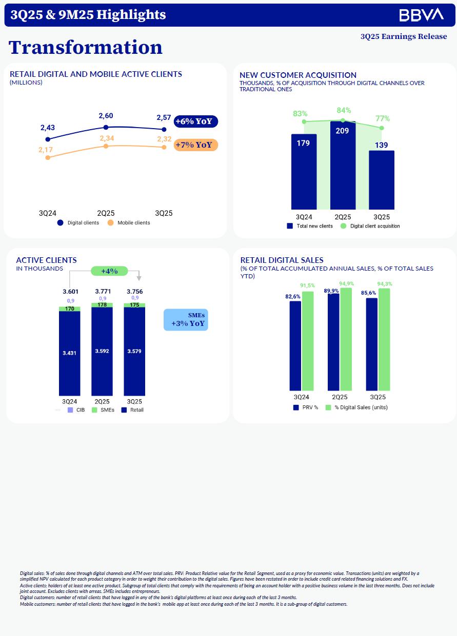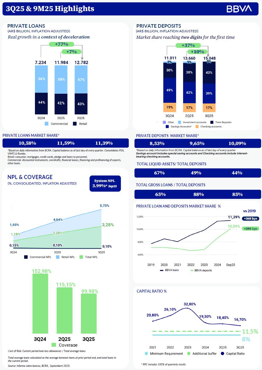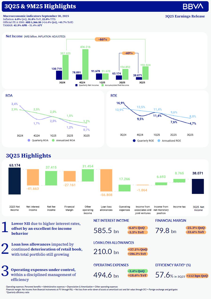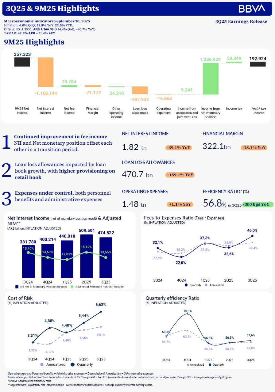 ·BBVA Argentina's inflation-adjusted net income in 3Q25 was $38.1 billion, 39.7% lower than that recorded in the second quarter of 2025 (2Q25), and 70.9% lower than the result reported on the third quarter of 2024 (3Q24). The nine month accumulated net income for 2025 was $192.9 billion, 46.0% below the result reported for the same period of 2024.