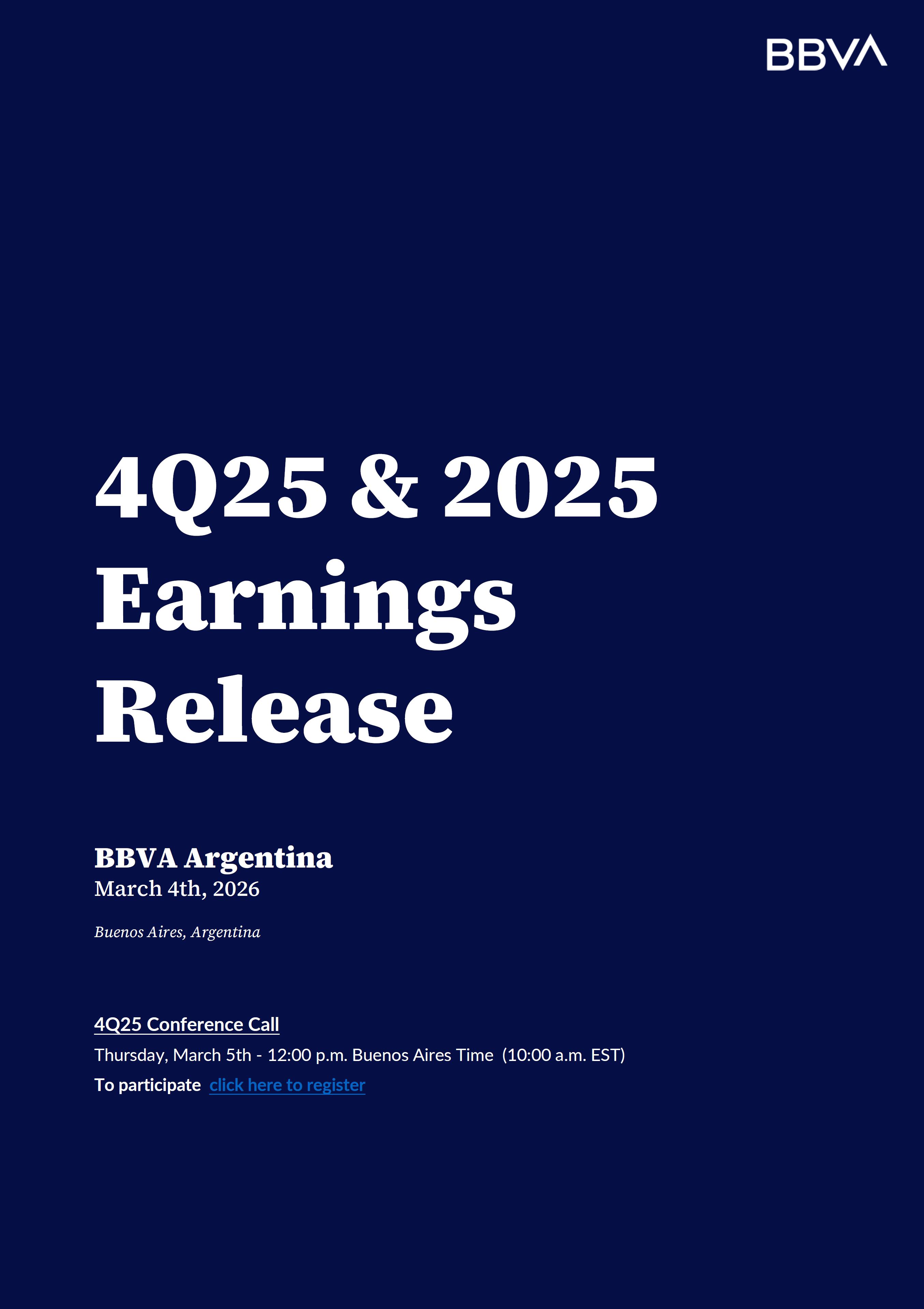 Buenos Aires, November 25, 2025 – Banco BBVA Argentina S.A (NYSE; BYMA; MAE: BBAR; LATIBEX: XBBAR) (“BBVA Argentina” or “BBVA” or “the Bank”) announced today its consolidated results for the fourth quarter (4Q25), ended on December 31, 2025. As of January 1, 2020, the Bank started to inform its inflation adjusted results pursuant to IAS 29 reporting. To facilitate comparison, figures of comparable quarters of 2024 and 2025 have been updated according to IAS 29 reporting to reflect the accumulated effect of inflation adjustment for each period up to December 31, 2025.