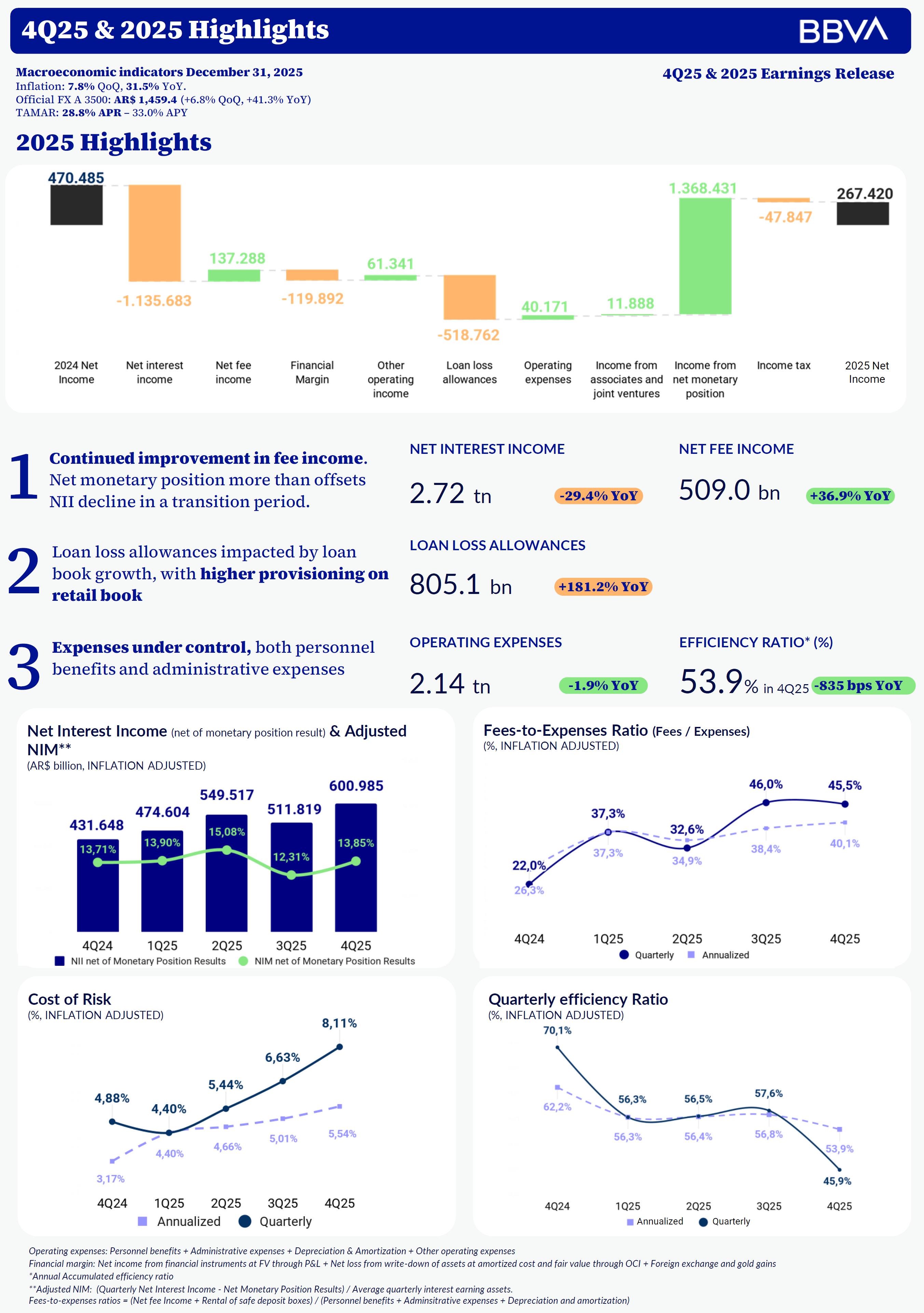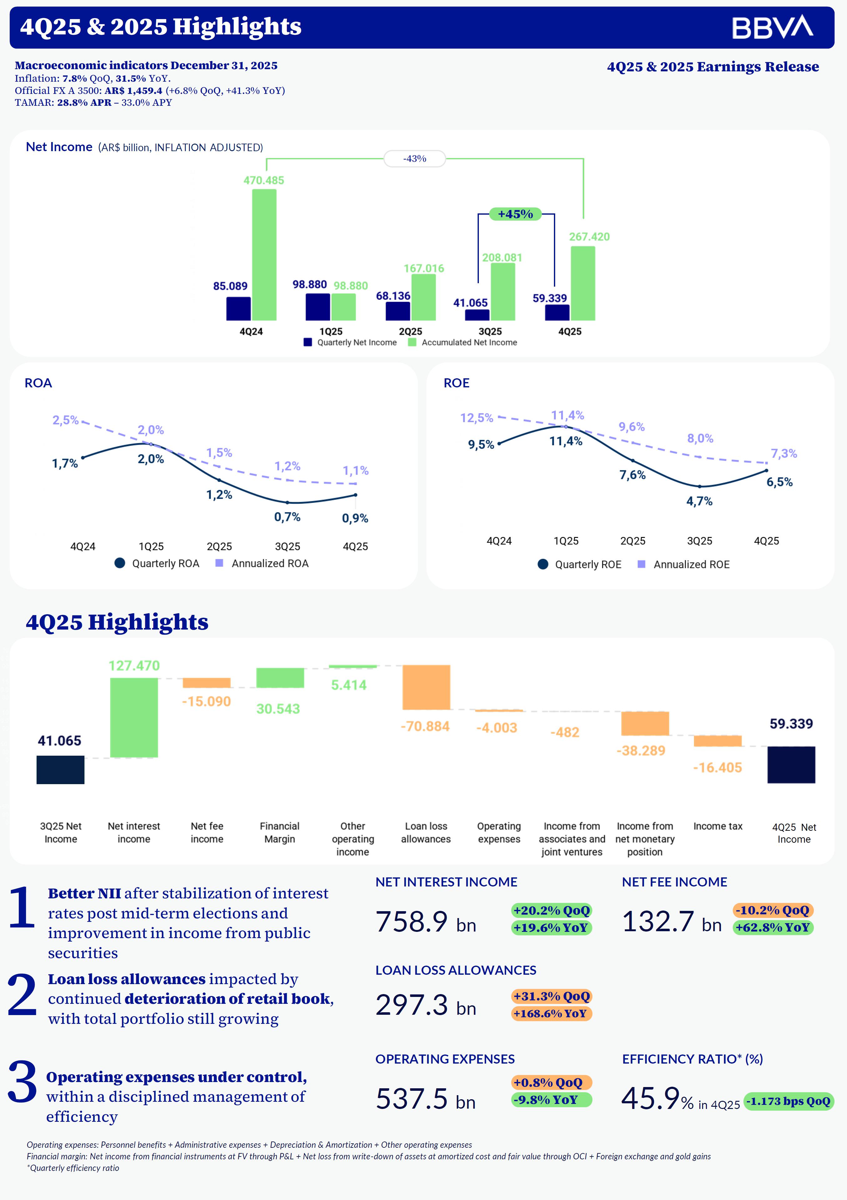BBVA Argentina's inflation-adjusted net income in 4Q25 was $59.3 billion, 44.5% higher than the one recorded in the third quarter of 2025 (3Q25), and 30.0% lower than the result reported in the fourth quarter of 2024 (4Q24). The twelve month accumulated net income for 2025 was $267.4 billion, 43.2% below the result reported for the same period of 2024.