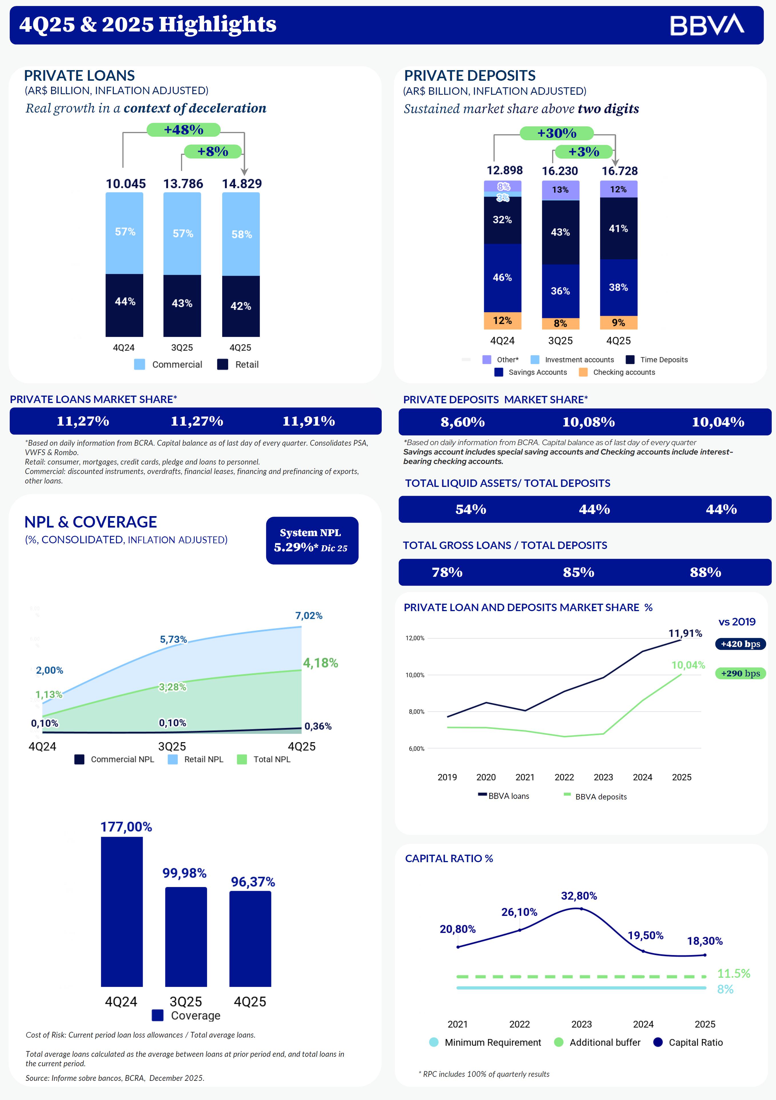4Q25 Conference Call Thursday, March 5th 12:00 p.m. Buenos Aires Time (10:00 a.m. EST) To participate click here to register BBVA Argentina March 4th, 2026 Buenos Aires, Argentina 4Q25 & 2025 Earnings Release Better NII Better NIIafter stabilization of interest after stabilization of interest rates post midrates post mid--term elections and term elections and improvement in income from public improvement in income from public securitiessecurities NET INTEREST INCOME NET INTEREST INCOME Operating expenses under control, Operating expenses under control,within a disciplined management of within a disciplined management of efficiencyefficiency OPERATING EXPENSES OPERATING EXPENSES EFFICIENCY RATIO* (%) EFFICIENCY RATIO* (%) 45.9 45.9% % in 4Q25in 4Q25 Loan loss allowances Loan loss allowancesimpacted by impacted by continued continued deterioration of retail bookdeterioration of retail book, , with total portfolio still growingwith total portfolio still growing 297.3 297.3 bnbn LOAN LOSS ALLOWANCES LOAN LOSS ALLOWANCES 1 1 3 3 2 2 758.9 758.9 bnbn NET FEE INCOME NET FEE INCOME 132.7 132.7bnbn 537.5 537.5bnbn Highlights Highlights 4Q25 & 2025 Earnings Release 4Q25 & 2025 Earnings Release Operating expenses: Personnel benefits + Administrative expenses + Depreciation & Amortization + Other operating expenses Operating expenses: Personnel benefits + Administrative expenses + Depreciation & Amortization + Other operating expenses Financial margin: Net income from financial instruments at FV through P&L + Net loss from write Financial margin: Net income from financial instruments at FV through P&L + Net loss from write--down of assets at amortized costdown of assets at amortized costand fair value through OCI + Foreign exchange and gold gainsand fair value through OCI + Foreign exchange and gold gains *Quarterly efficiency ratio *Quarterly efficiency ratio 4Q25 Net 4Q25 Net IncomeIncome 4Q25 & 2025 Highlights 4Q25 & 2025 Highlights 4Q25 4Q25HighlightsHighlights Net Income Net Income ((AR$ billionAR$ billion, , INFLATION ADJUSTED)INFLATION ADJUSTED) ROA ROA ROE ROE +20.2% QoQ +20.2% QoQ +19.6% YoY +19.6% YoY +31.3% QoQ +31.3% QoQ +168.6% YoY +168.6% YoY +0.8% QoQ +0.8% QoQ - -9.8% YoY9.8% YoY - -1.173 bps QoQ1.173 bps QoQ Macroeconomic indicators December 31, 2025 Macroeconomic indicators December 31, 2025 Inflation: Inflation: 7.8%7.8%QoQ, QoQ, 31.5%31.5%YoY.YoY. Official FX A 3500: Official FX A 3500: AR$ 1,459.4AR$ 1,459.4(+6.8% QoQ, +41.3% YoY)(+6.8% QoQ, +41.3% YoY) TAMAR: TAMAR: 28.8% APR28.8% APR––33.0% APY33.0% APY +45% +45% - -43%43% - -10.2% QoQ10.2% QoQ +62.8% YoY +62.8% YoY 2025 2025HighlightsHighlights NET INTEREST INCOME NET INTEREST INCOME Expenses under control, Expenses under control,both personnel both personnel benefits and administrative expenses benefits and administrative expenses OPERATING EXPENSES OPERATING EXPENSES EFFICIENCY RATIO* (%) EFFICIENCY RATIO* (%) 53.9 53.9% % in 4Q25in 4Q25 Loan loss allowances impacted by loan Loan loss allowances impacted by loan book growth, with book growth, with higher provisioning on higher provisioning on retail bookretail book 805.1 805.1bnbn LOAN LOSS ALLOWANCES LOAN LOSS ALLOWANCES 1 1 3 3 2 2 2.72 2.72tntn NET FEE INCOME NET FEE INCOME 509.0 509.0 bnbn 2.14 2.14 tntn Operating expenses: Personnel benefits + Administrative expenses + Depreciation & Amortization + Other operating expenses Operating expenses: Personnel benefits + Administrative expenses + Depreciation & Amortization + Other operating expenses Financial margin: Net income from financial instruments at FV through P&L + Net loss from write Financial margin: Net income from financial instruments at FV through P&L + Net loss from write--down of assets at amortized costdown of assets at amortized costand fair value through OCI + Foreign exchange and gold gainsand fair value through OCI + Foreign exchange and gold gains *Annual Accumulated efficiency ratio *Annual Accumulated efficiency ratio **Adjusted NIM: (Quarterly Net Interest Income **Adjusted NIM: (Quarterly Net Interest Income --Net Monetary Position Results) / Average quarterly interest earning assets.Net Monetary Position Results) / Average quarterly interest earning assets. Fees Fees--toto--expenses ratios = (Net fee Income + Rental of safe deposit boxes) / (Personnel benefits + Adminsitrative expenses + Deprexpenses ratios = (Net fee Income + Rental of safe deposit boxes) / (Personnel benefits + Adminsitrative expenses + Depreciation and amortization)eciation and amortization) 2025 Net 2025 Net IncomeIncome - -29.4% YoY29.4% YoY +36.9% YoY +36.9% YoY +181.2% YoY +181.2% YoY - -1.9% YoY1.9% YoY Highlights Highlights 4Q25 & 2025 Earnings Release 4Q25 & 2025 Earnings Release 4Q25 & 2025 Highlights 4Q25 & 2025 Highlights - -835 bps YoY835 bps YoY Continued improvement in fee income Continued improvement in fee income. . Net monetary position more than offsets Net monetary position more than offsets NII decline in a transition period.NII decline in a transition period. Quarterly efficiency Ratio Quarterly efficiency Ratio (%, INFLATION ADJUSTED) (%, INFLATION ADJUSTED) Net Interest Income Net Interest Income (net of monetary position result)(net of monetary position result)& Adjusted & Adjusted NIM**NIM** (AR$ billion, INFLATION ADJUSTED) (AR$ billion, INFLATION ADJUSTED) Annualized Annualized Quarterly Quarterly Fees Fees--toto--Expenses Ratio Expenses Ratio (Fees / Expenses)(Fees / Expenses) (%, INFLATION ADJUSTED) (%, INFLATION ADJUSTED) Macroeconomic indicators December 31, 2025 Macroeconomic indicators December 31, 2025 Inflation: Inflation: 7.8%7.8%QoQ, QoQ, 31.5%31.5%YoY.YoY. Official FX A 3500: Official FX A 3500: AR$ 1,459.4AR$ 1,459.4(+6.8% QoQ, +41.3% YoY)(+6.8% QoQ, +41.3% YoY) TAMAR: TAMAR: 28.8% APR28.8% APR––33.0% APY33.0% APY Cost of Risk Cost of Risk (%, INFLATION ADJUSTED) (%, INFLATION ADJUSTED) NPL & COVERAGE NPL & COVERAGE PRIVATE LOANS PRIVATE LOANS PRIVATE DEPOSITS PRIVATE DEPOSITS PRIVAT