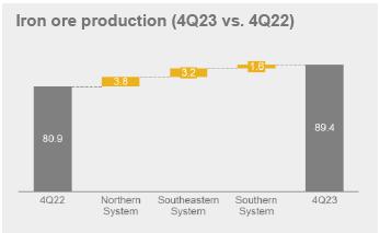 ·Southern System production increased by 1.6 Mt y/y and 1.2 Mt q/q, mainly driven by (i) improved performance at the Vargem Grande Complex; and (ii) higher third-party purchases, partially offset by lower production at Viga, which resumed operations in late November, as well as lower run-of-mine output.