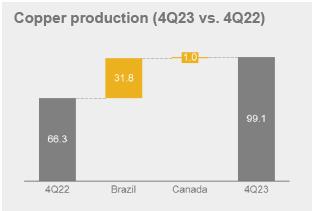 Copper production totaled 99.1 kt in Q4, increasing by 50% y/y. In 2023, production increased by 29% y/y, totaling 326.6 kt, slightly above our revised 325 kt guidance. The improved performance was mainly a result of Salobo 3’s successful ramp-up, with production at the Salobo complex increasing by 87% y/y in Q4, as well as the better performance of Sossego’s plant.