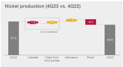 ·Nickel production at Onça Puma decreased by 4.5 kt y/y and 5.2 kt q/q as operations are halted for the furnace rebuild to be completed in 1Q24.