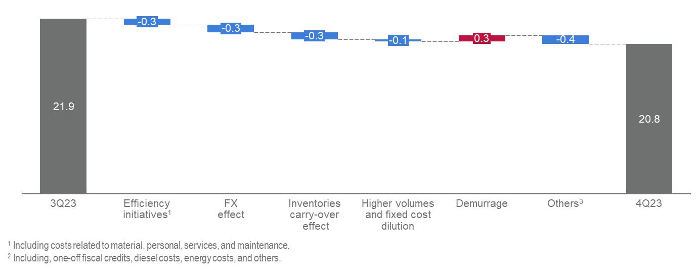 ·Iron ore fines C1 cash cost ex-3rd party purchase decreased 5% q/q, reaching US$ 20.8/t in Q4. In 2023, it reached US$ 22.3/t, below the US$ 22.5/t guidance for the year.