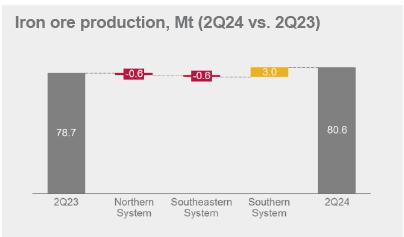 Iron ore production reached 80.6 Mt in Q2, 1.9 Mt higher y/y, supported by a robust performance at S11D and Vargem Grande. This quarter’s performance reinforces our confidence in achieving the upper end of the 2024 production guidance. Pellets production totaled 8.9 Mt, slightly lower y/y. Iron ore sales reached 79.8 Mt, 5.4 Mt (+7.3%) higher y/y.