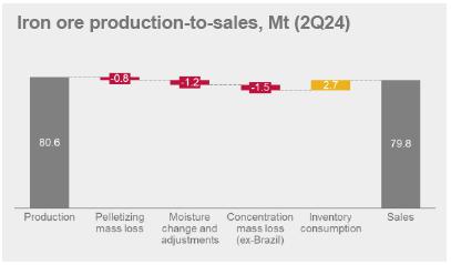 Pellets: production was slightly lower, down 0.2 Mt y/y, driven by lower pellet feed availability at the Vargem Grande plant and maintenance at the São Luis plant.