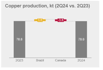 Copper production totaled 78.6 kt, flat y/y, as a better performance at the Salobo 1&2 and Sossego plants was offset by the bi-annual maintenance in Sudbury.