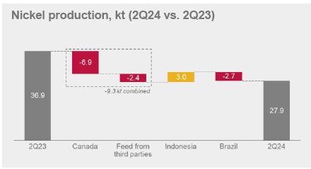 Nickel production totaled 27.9 kt, 24% lower y/y, mainly reflecting the planned maintenance strategy at the nickel processing plants.