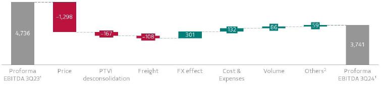 Proforma Adjusted EBITDA of US$ 3.7 billion, 21% lower y/y and 6% lower q/q, mainly as a result of weaker realized iron ore fines prices and higher freight costs, partially offset by the positive effect of BRL depreciation, lower costs and expenses and higher sales volumes.