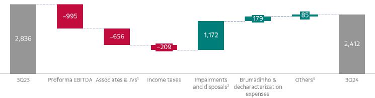 1 Considers equity results and EBITDA from associates and JVs. 2 Impairment and disposal of non-current assets, net. Includes the sale of 50% of VODC's share capital to Apollo of which: US$ 600 million in proceedings received from the sale, US$ 600 million related to the fair value of 50% interest retained and US$ 22 million in other effects related to the deconsolidation. Includes adjustment of US$ 94 million in 3Q24 and US$ 47 million in 3Q23 to reflect the performance of the streaming transactions at market price. 3 Includes (i) US$ 32 million in depreciation, depletion & amortization, (ii) US$ 11 million in financial results and (iii) US$ 42 million net income/loss attributable to non-controlling interests.