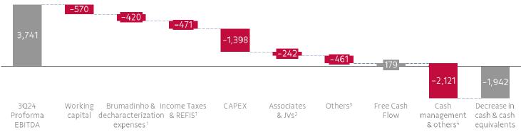 ¹ Find more information on expenses in Annex 4: Brumadinho & Decharacterization. 2 Includes adjustment of US$ 94 million in 3Q24, US$ 83 million in 2Q24, US$ 243 million in 9M24, US$ 47 million in 3Q23 and US$ 134 million in 9M23 to reflect the performance of the streaming transactions at market price. 3 Excluding expenses related to Brumadinho. 4 Starting from 1Q24 the EBITDA will be reported including the EBITDA proportionate from associates and JVs and the previous periods were restated. Previously, the EBITDA reflected solely the dividends received from associates and JVs. 5 Net.