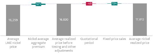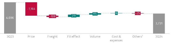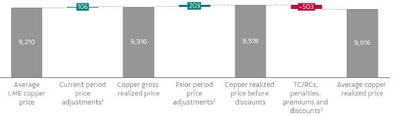 ¹ Comprises (i) the realized quotational period effects (based on sales distribution in the prior three months, as well as the differences between the LME price at the moment of sale and the LME average price), with a positive impact of US$48/t and (ii) fixed-price sales, with a positive impact of US$134/t.