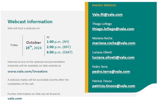 ·   Commissioning of the Vargem Grande 1 project’s wet processing operations started in September, one month ahead of schedule. The project represents an important step towards Vale’s iron ore production guidance of 340-360 Mt in 2026, by resuming approximately 15 Mtpy of iron ore capacity and improving the site’s iron content by nearly 2 p.p. Other key projects underway: +15 Mt at Capanema and +20 Mt at S11D are 91% and 67% complete and on track to start in 1H25 and 2H26.