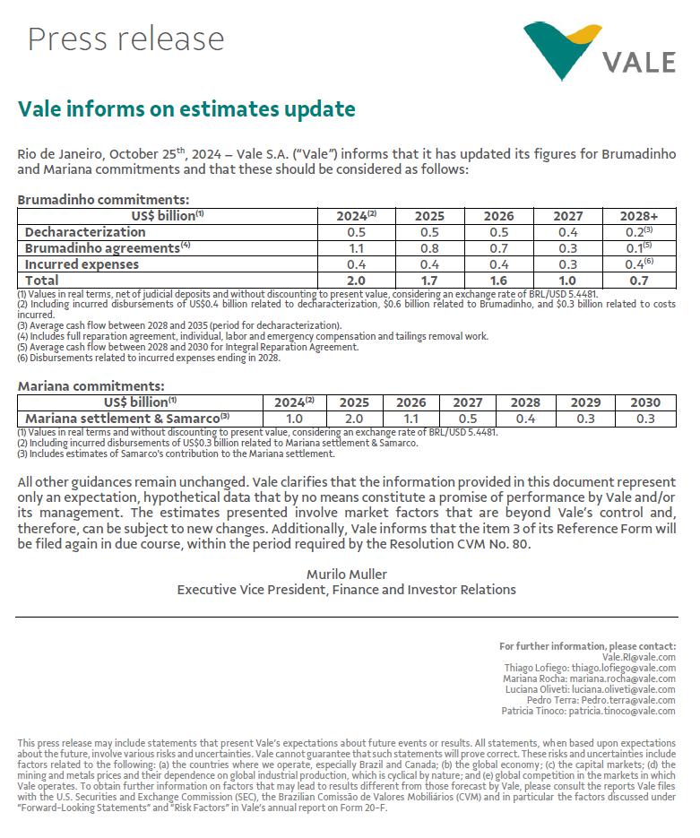 Vale informs on estimates update Rio de Janeiro, October 25th, 2024 – Vale S.A. (“Vale”) informs that it has updated its figures for Brumadinho and Mariana commitments and that these should be considered as follows: Brumadinho commitments: US$ billion(1) 2024(2) 2025 2026 2027 2028+ Decharacterization 0.5 0.5 0.5 0.4 0.2(3) Brumadinho agreements(4) 1.1 0.8 0.7 0.3 0.1(5) Incurred expenses 0.4 0.4 0.4 0.3 0.4(6) Total 2.0 1.7 1.6 1.0 0.7 (1) Values in real terms, net of judicial deposits and without discounting to present value, considering an exchange rate of BRL/USD 5.4481. (2) Including incurred disbursements of US$0.4 billion related to decharacterization, $0.6 billion related to Brumadinho, and $0.3 billion related to costs incurred. (3) Average cash flow between 2028 and 2035 (period for decharacterization). (4) Includes full reparation agreement, individual, labor and emergency compensation and tailings removal work. (5) Average cash flow between 2028 and 2030 for Integral Reparation Agreement. (6) Disbursements related to incurred expenses ending in 2028. Mariana commitments: US$ billion(1) 2024(2) 2025 2026 2027 2028 2029 2030 Mariana settlement & Samarco(3) 1.0 2.0 1.1 0.5 0.4 0.3 0.3 (1) Values in real terms and without discounting to present value, considering an exchange rate of BRL/USD 5.4481. (2) Including incurred disbursements of US$0.3 billion related to Mariana settlement & Samarco. (3) Includes estimates of Samarco's contribution to the Mariana settlement. All other guidances remain unchanged. Vale clarifies that the information provided in this document represent only an expectation, hypothetical data that by no means constitute a promise of performance by Vale and/or its management. The estimates presented involve market factors that are beyond Vale’s control and, therefore, can be subject to new changes. Additionally, Vale informs that the item 3 of its Reference Form will be filed again in due course, within the period required by the Resolution CVM No. 80. Murilo Muller Executive Vice President, Finance and Investor Relations For further information, please contact: Vale.RI@vale.com Thiago Lofiego: thiago.lofiego@vale.com Mariana Rocha: mariana.rocha@vale.com Luciana Oliveti: luciana.oliveti@vale.com Pedro Terra: Pedro.terra@vale.com Patricia Tinoco: patricia.tinoco@vale.com This press release may include statements that present Vale’s expectations about future events or results. All statements, when based upon expectations about the future, involve various risks and uncertainties. Vale cannot guarantee that such statements will prove correct. These risks and uncertainties include factors related to the following: (a) the countries where we operate, especially Brazil and Canada; (b) the global economy; (c) the capital markets; (d) the mining and metals prices and their dependence on global industrial production, which is cyclical by nature; and (e) global competition in the markets in which Vale operates. To obtain further information on factors that may lead to results different from those forecast by Vale, please consult the reports Vale files with the U.S. Securities and Exchange Commission (SEC), the Brazilian Comissão de Valores Mobiliários (CVM) and in particular the factors discussed under “Forward-Looking Statements” and “Risk Factors” in Vale’s annual report on Form 20-F. Press release