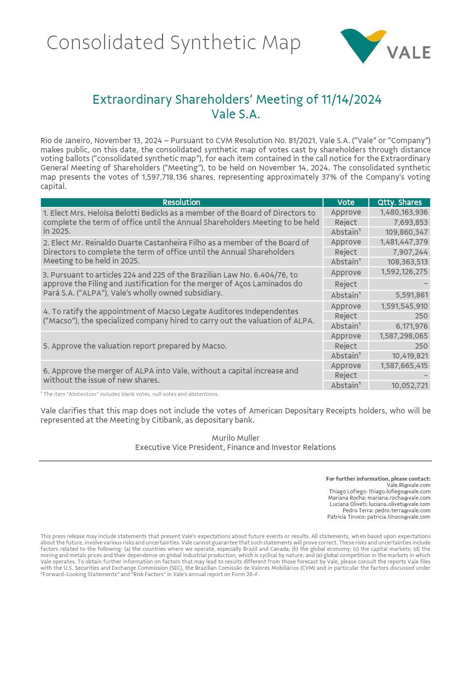 Consolidated Synthetic Map Extraordinary Shareholders’ Meeting of 11/14/2024 Vale S.A. Rio de Janeiro, November 13, 2024 – Pursuant to CVM Resolution No. 81/2021, Vale S.A. (“Vale” or “Company”) makes public, on this date, the consolidated synthetic map of votes cast by shareholders through distance voting ballots (“consolidated synthetic map”), for each item contained in the call notice for the Extraordinary General Meeting of Shareholders (“Meeting”), to be held on November 14, 2024. The consolidated synthetic map presents the votes of 1,597,718,136 shares, representing approximately 37% of the Company's voting capital. Resolution Vote Qtty. Shares 1. Elect Mrs. Heloísa Belotti Bedicks as a member of the Board of Directors to complete the term of office until the Annual Shareholders Meeting to be held in 2025. Approve 1,480,163,936 Reject 7,693,853 Abstain¹ 109,860,347 2. Elect Mr. Reinaldo Duarte Castanheira Filho as a member of the Board of Directors to complete the term of office until the Annual Shareholders Meeting to be held in 2025. Approve 1,481,447,379 Reject 7,907,244 Abstain¹ 108,363,513 3. Pursuant to articles 224 and 225 of the Brazilian Law No. 6.404/76, to approve the Filing and Justification for the merger of Aços Laminados do Pará S.A. (“ALPA”), Vale's wholly owned subsidiary. Approve 1,592,126,275 Reject - Abstain¹ 5,591,861 4. To ratify the appointment of Macso Legate Auditores Independentes (“Macso”), the specialized company hired to carry out the valuation of ALPA. Approve 1,591,545,910 Reject 250 Abstain¹ 6,171,976 5. Approve the valuation report prepared by Macso. Approve 1,587,298,065 Reject 250 Abstain¹ 10,419,821 6. Approve the merger of ALPA into Vale, without a capital increase and without the issue of new shares. Approve 1,587,665,415 Reject - Abstain¹ 10,052,721 ¹ The item “Abstention” includes blank votes, null votes and abstentions. Vale clarifies that this map does not include the votes of American Depositary Receipts holders, who will be represented at the Meeting by Citibank, as depositary bank. Murilo Muller Executive Vice President, Finance and Investor Relations For further information, please contact: Vale.RI@vale.com Thiago Lofiego: thiago.lofiego@vale.com Mariana Rocha: mariana.rocha@vale.com Luciana Oliveti: luciana.oliveti@vale.com Pedro Terra: pedro.terra@vale.com Patricia Tinoco: patricia.tinoco@vale.com This press release may include statements that present Vale’s expectations about future events or results. All statements, when based upon expectations about the future, involve various risks and uncertainties. Vale cannot guarantee that such statements will prove correct. These risks and uncertainties include factors related to the following: (a) the countries where we operate, especially Brazil and Canada; (b) the global economy; (c) the capital markets; (d) the mining and metals prices and their dependence on global industrial production, which is cyclical by nature; and (e) global competition in the markets in which Vale operates. To obtain further information on factors that may lead to results different from those forecast by Vale, please consult the reports Vale files with the U.S. Securities and Exchange Commission (SEC), the Brazilian Comissão de Valores Mobiliários (CVM) and in particular the factors discussed under “Forward-Looking Statements” and “Risk Factors” in Vale’s annual report on Form 20-F. Consolidated Synthetic Map