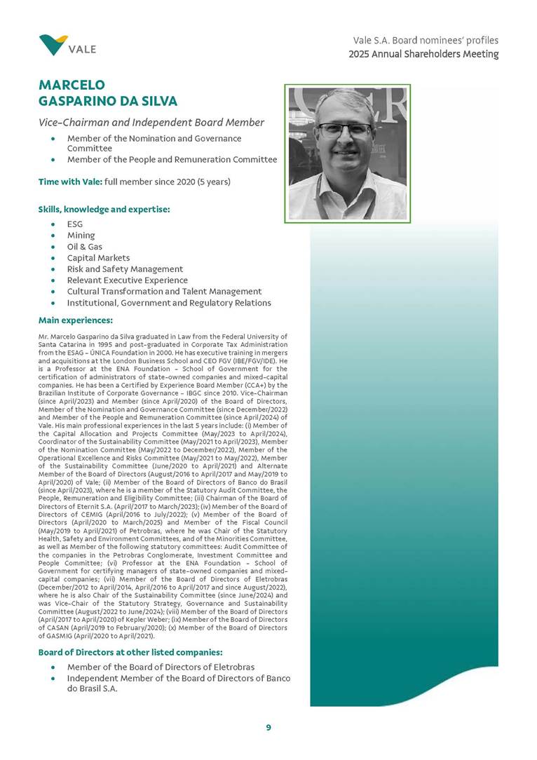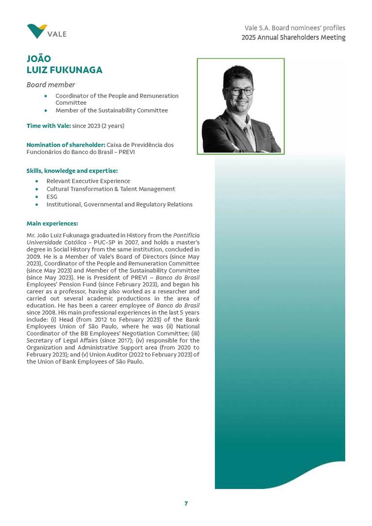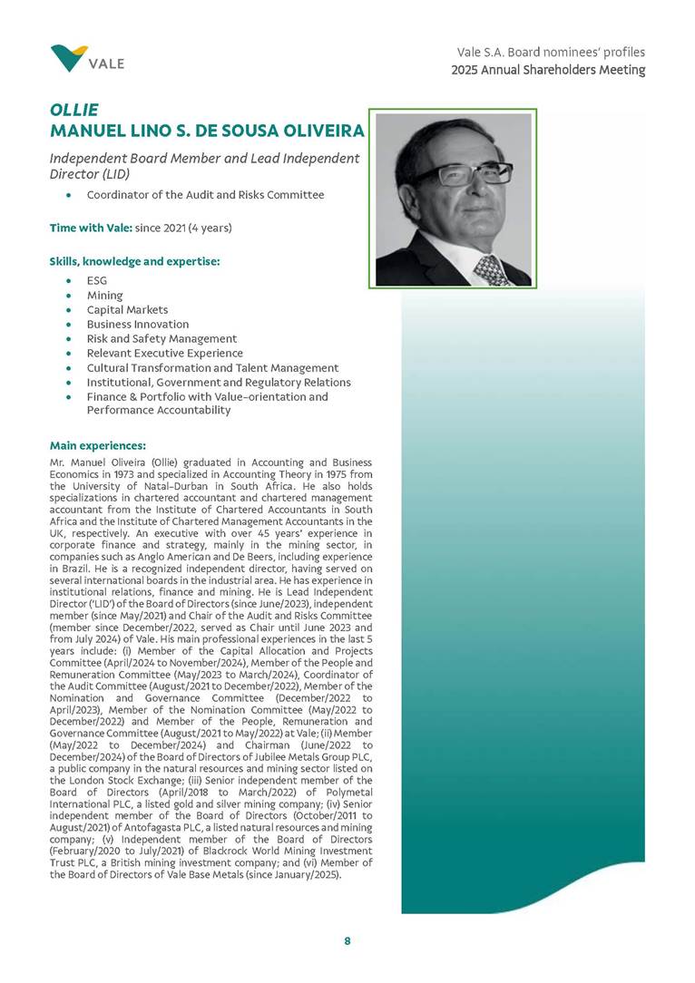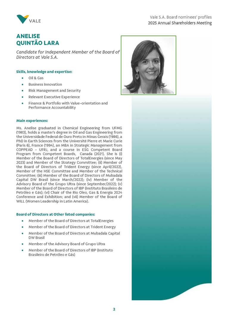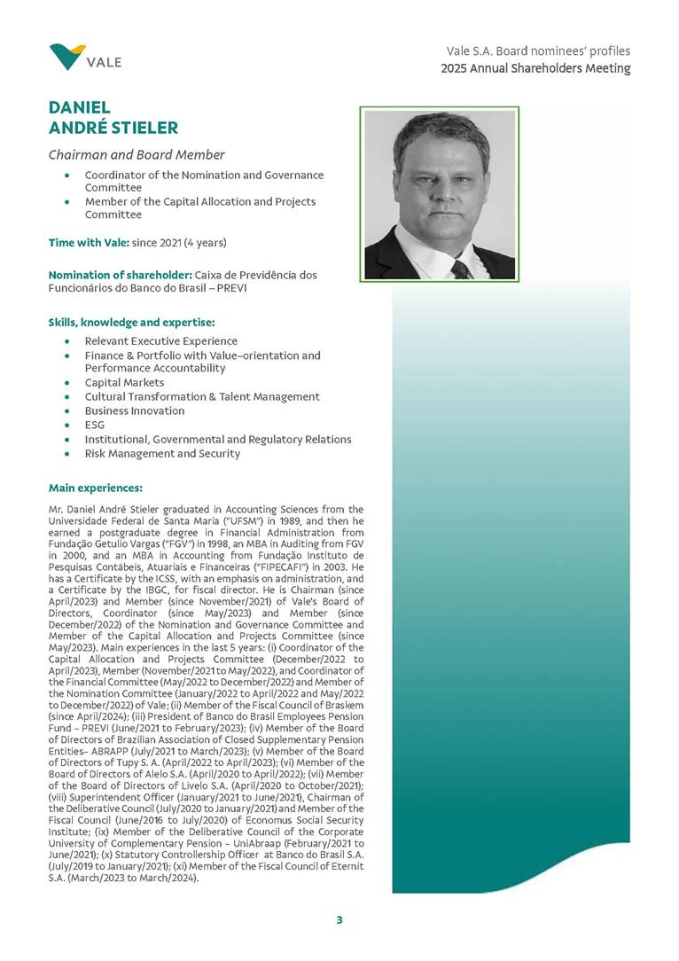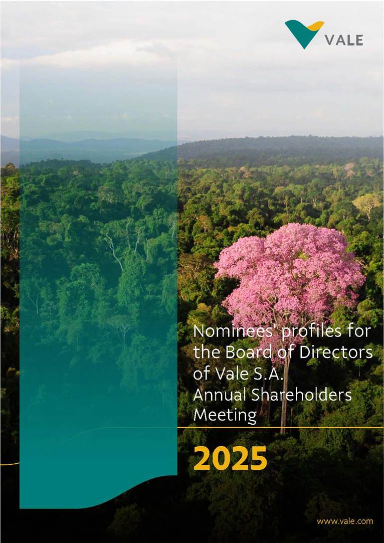 Rio de Janeiro, February 24, 2025 – The Board of Directors of Vale S.A. (“Vale” or “Company”) has reviewed and approved today the list of nominees prepared by the Nomination and Governance Committee for the 2025-2027 term of office, as set forth below. The nominees are subject to election at the Annual General Meeting, which is expected to be held on April 30, 2025, with the convening scheduled for March 17, 2025.