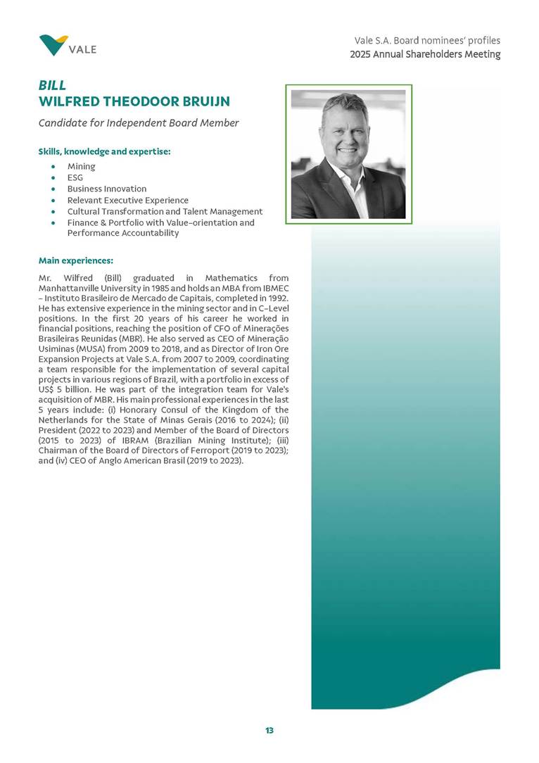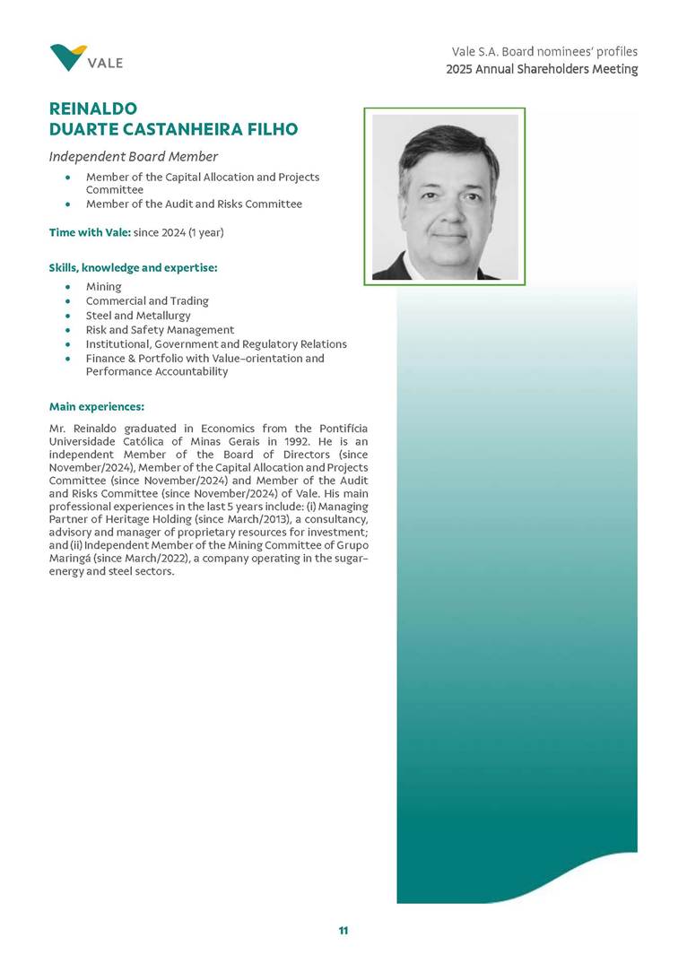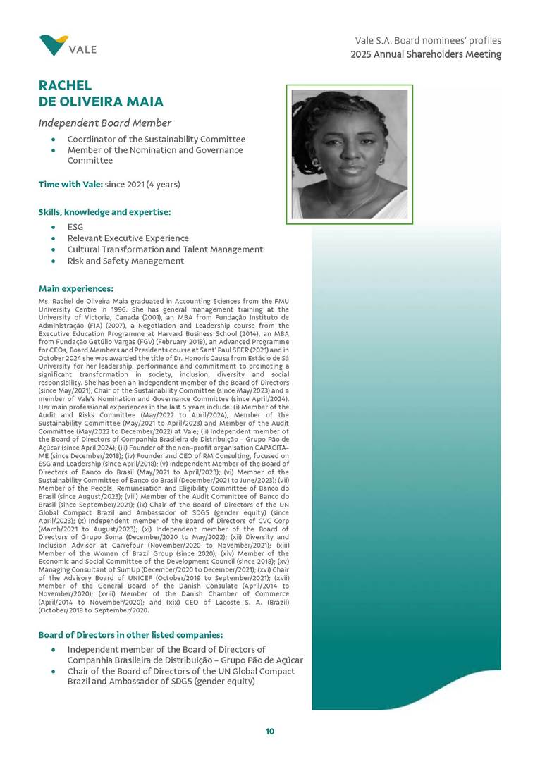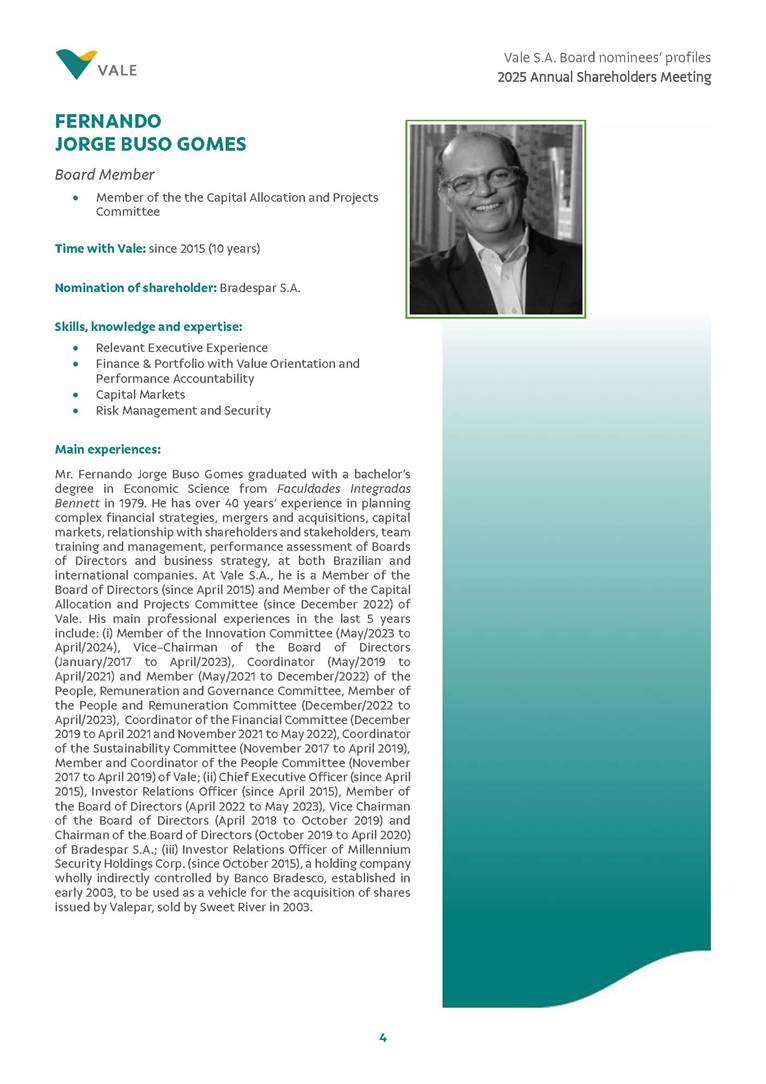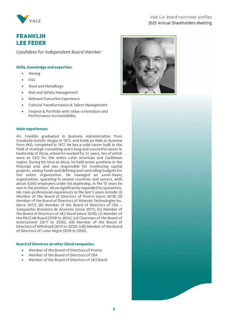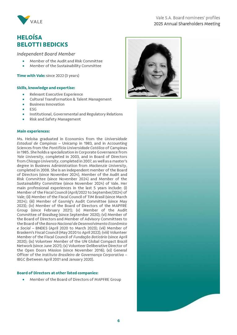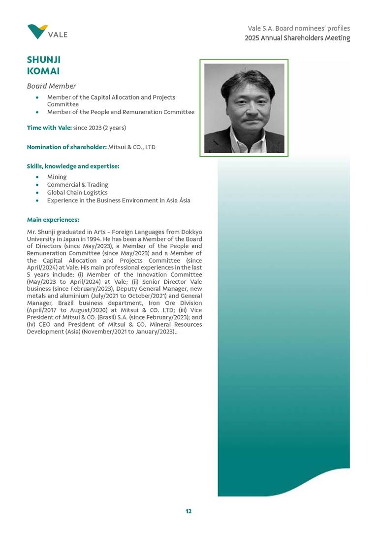 Rio de Janeiro, February 24, 2025 – The Board of Directors of Vale S.A. (“Vale” or “Company”) has reviewed and approved today the list of nominees prepared by the Nomination and Governance Committee for the 2025-2027 term of office, as set forth below. The nominees are subject to election at the Annual General Meeting, which is expected to be held on April 30, 2025, with the convening scheduled for March 17, 2025.