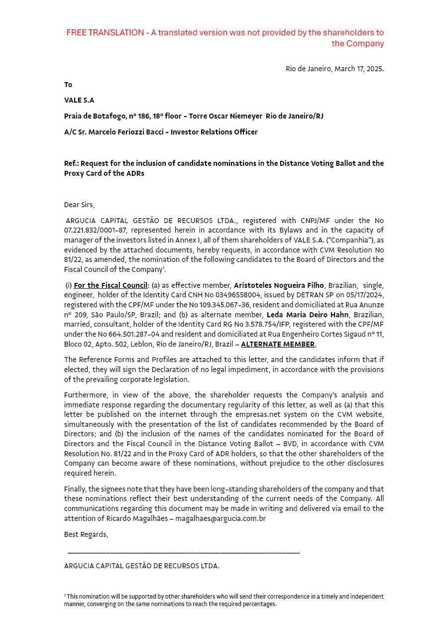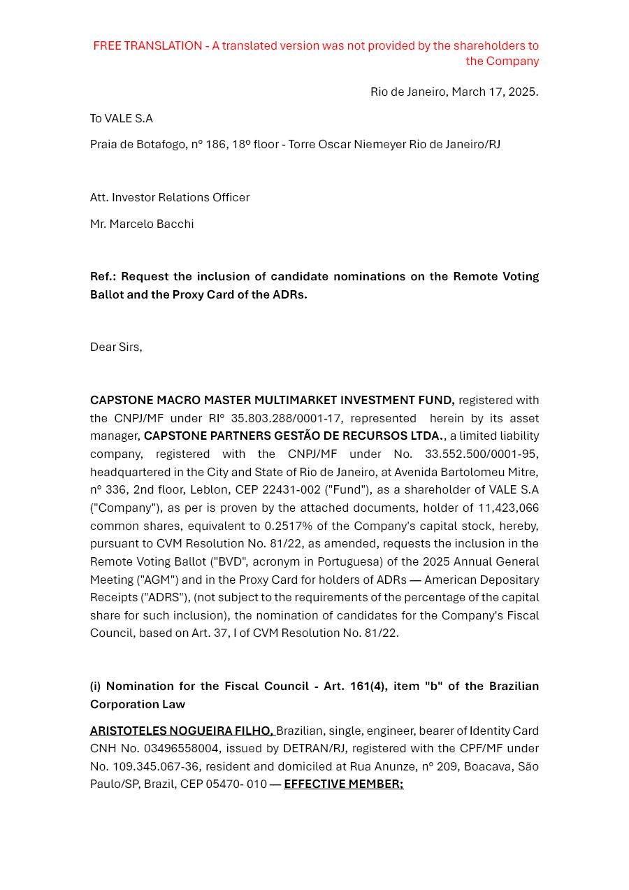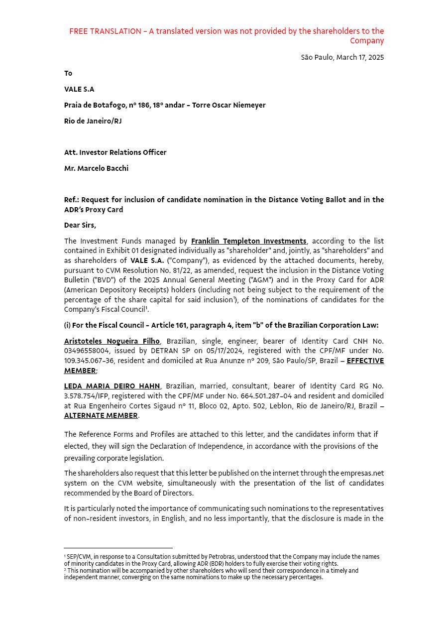 Rio de Janeiro, March 25, 2025 – Vale S.A (“Vale” or “Company”) confirms that on March 17, 2025, it has received from the shareholders Franklin Templeton Investments[1], Argucia Capital Gestão de Recursos Ltda.[2], and Capstone Partners Gestão de Recursos Ltda.[3], the nomination of 1 (one) candidate and his respective alternate member for the Fiscal Council’s composition for the 2025-2026 term, as mentioned below and as already reflected in the Distance Voting Ballot: