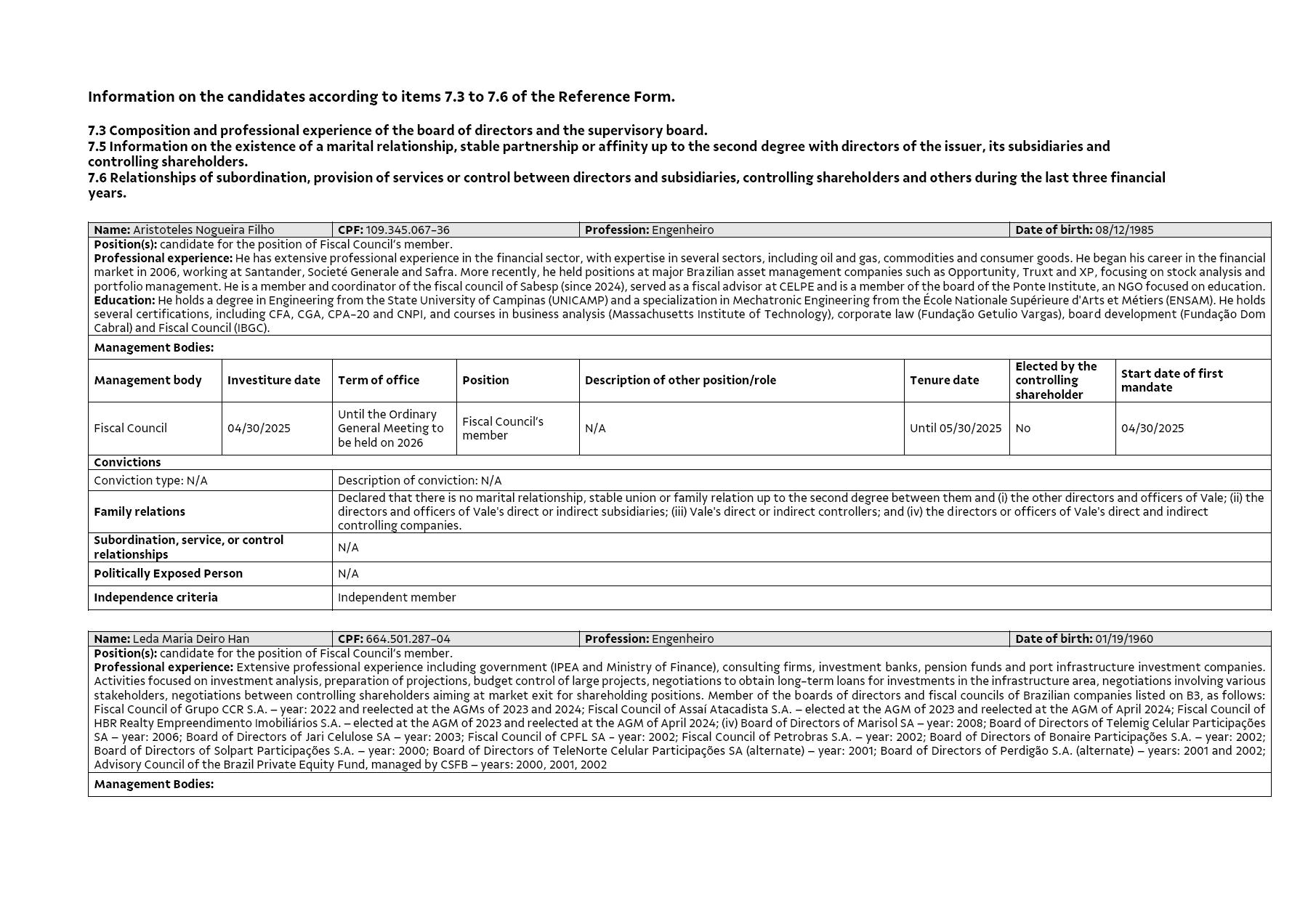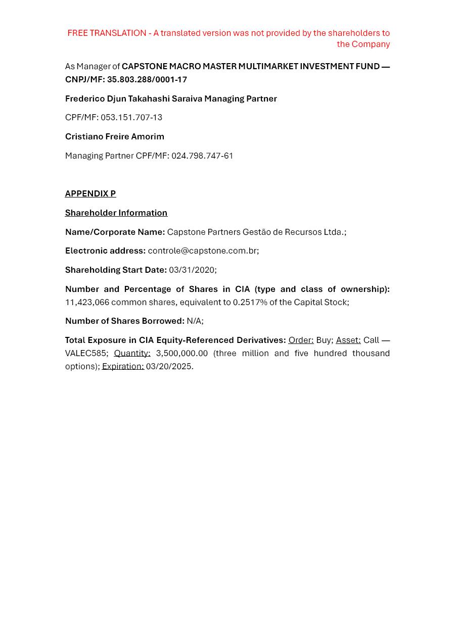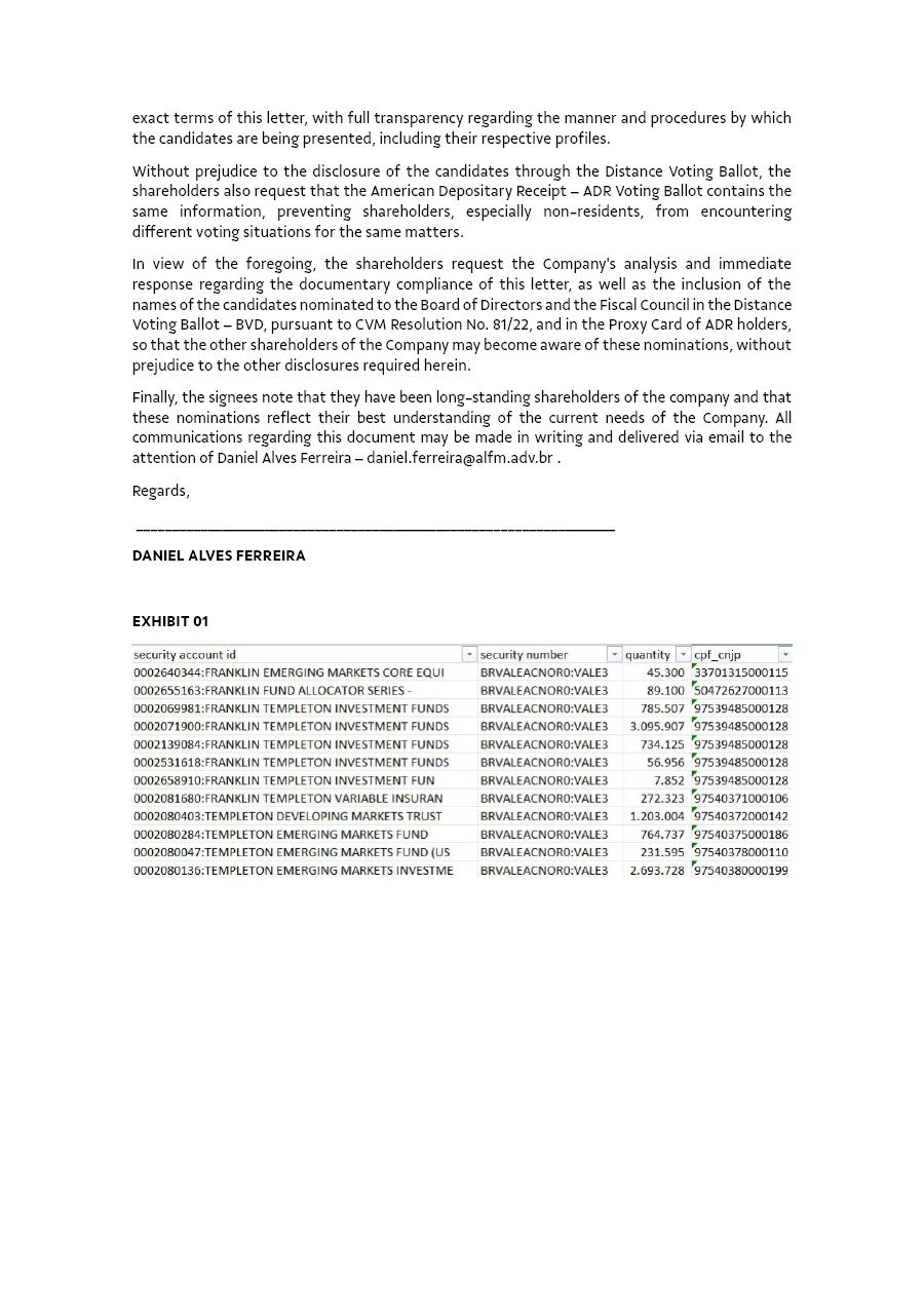 Rio de Janeiro, March 25, 2025 – Vale S.A (“Vale” or “Company”) confirms that on March 17, 2025, it has received from the shareholders Franklin Templeton Investments[1], Argucia Capital Gestão de Recursos Ltda.[2], and Capstone Partners Gestão de Recursos Ltda.[3], the nomination of 1 (one) candidate and his respective alternate member for the Fiscal Council’s composition for the 2025-2026 term, as mentioned below and as already reflected in the Distance Voting Ballot: